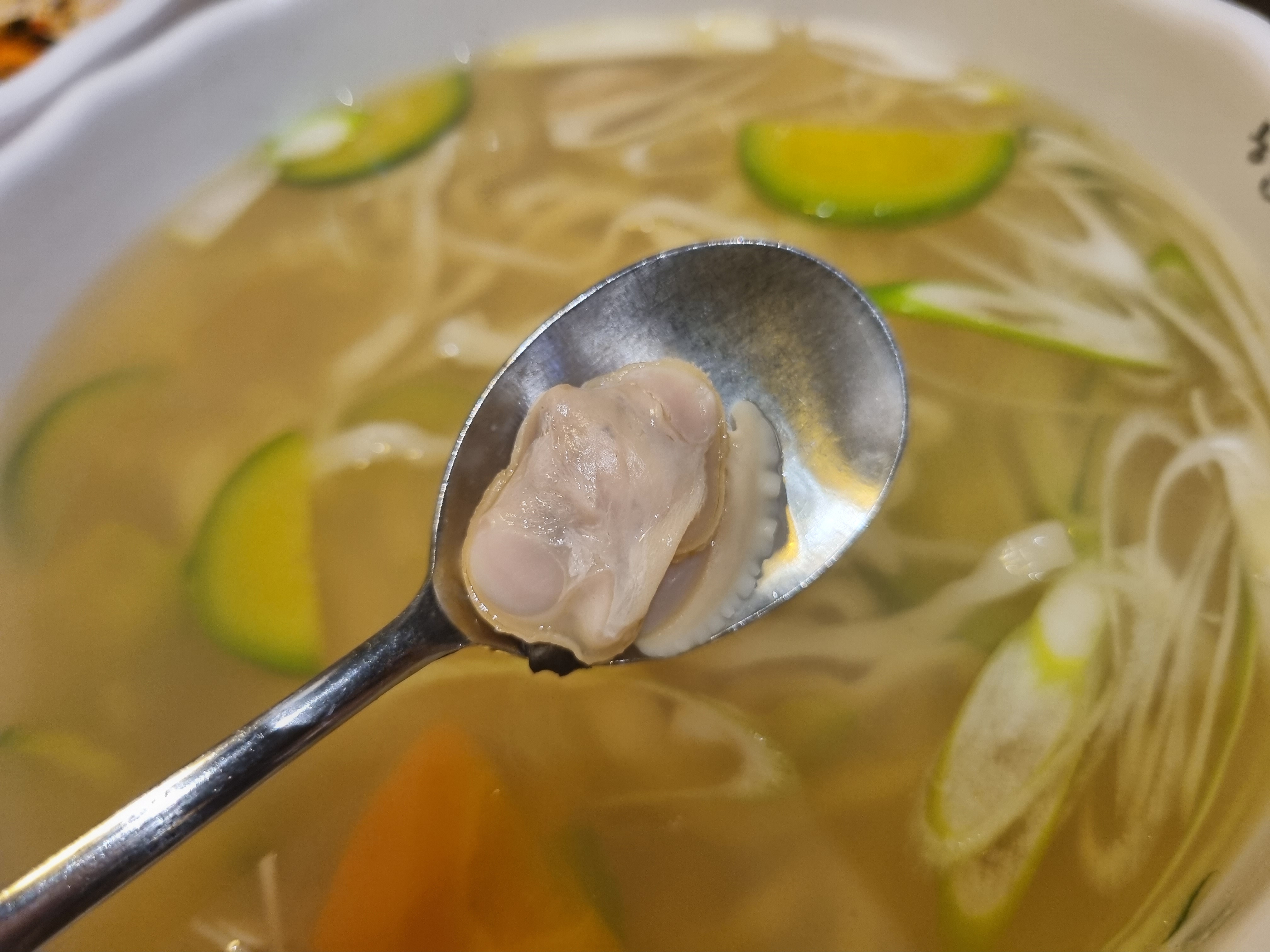 조개 국물이 찐하게 울어난 칼국수의 맛이며 칼국수는 탱탱한 식감입니다.