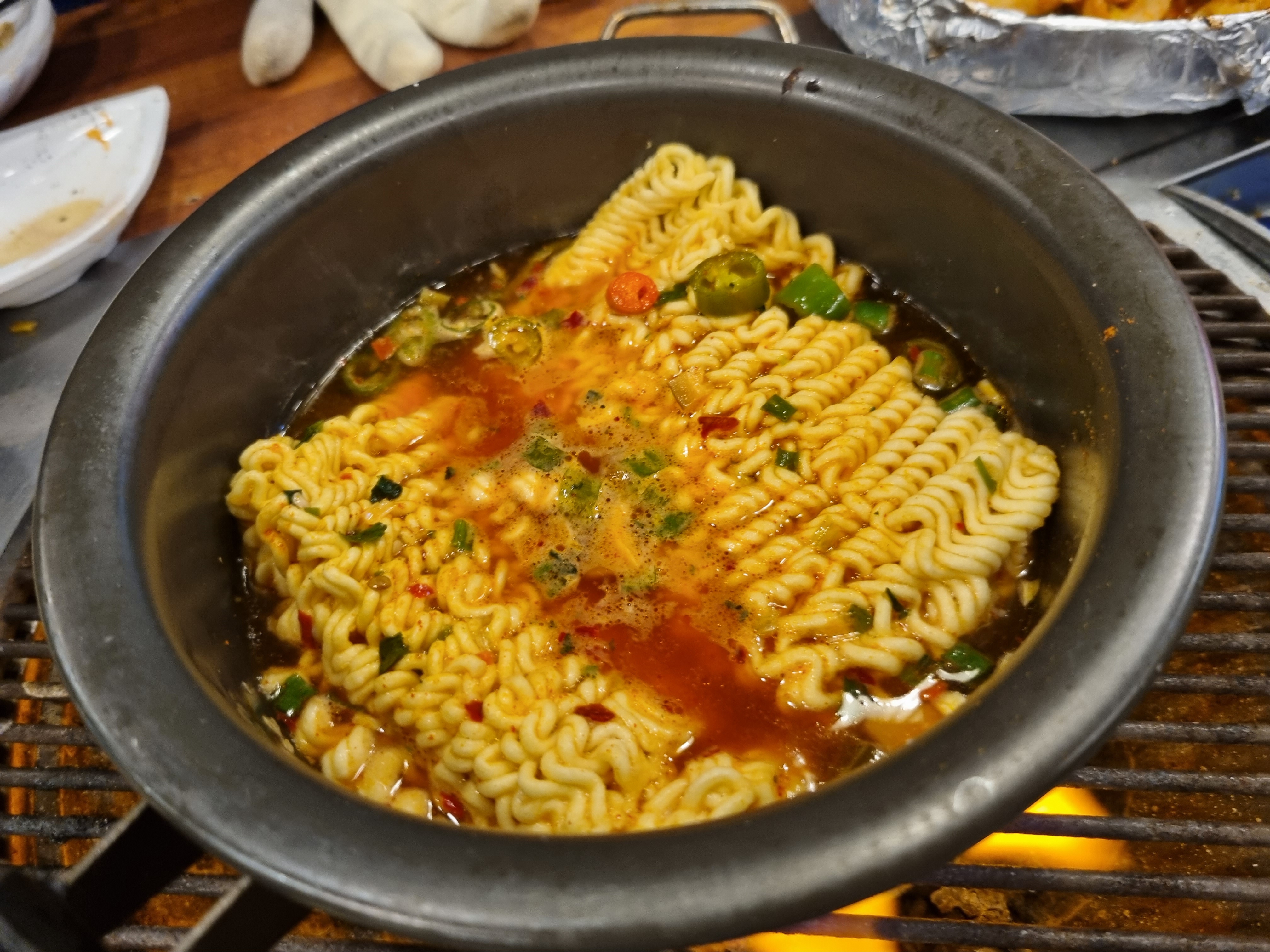 자리로 가져온 후 숯불 위에 올려서 끓여 먹으면 마치 해물탕처럼 해산물을 먹고 느끼했던 맛을 라면으로 딱 잡아줄 수 있습니다.