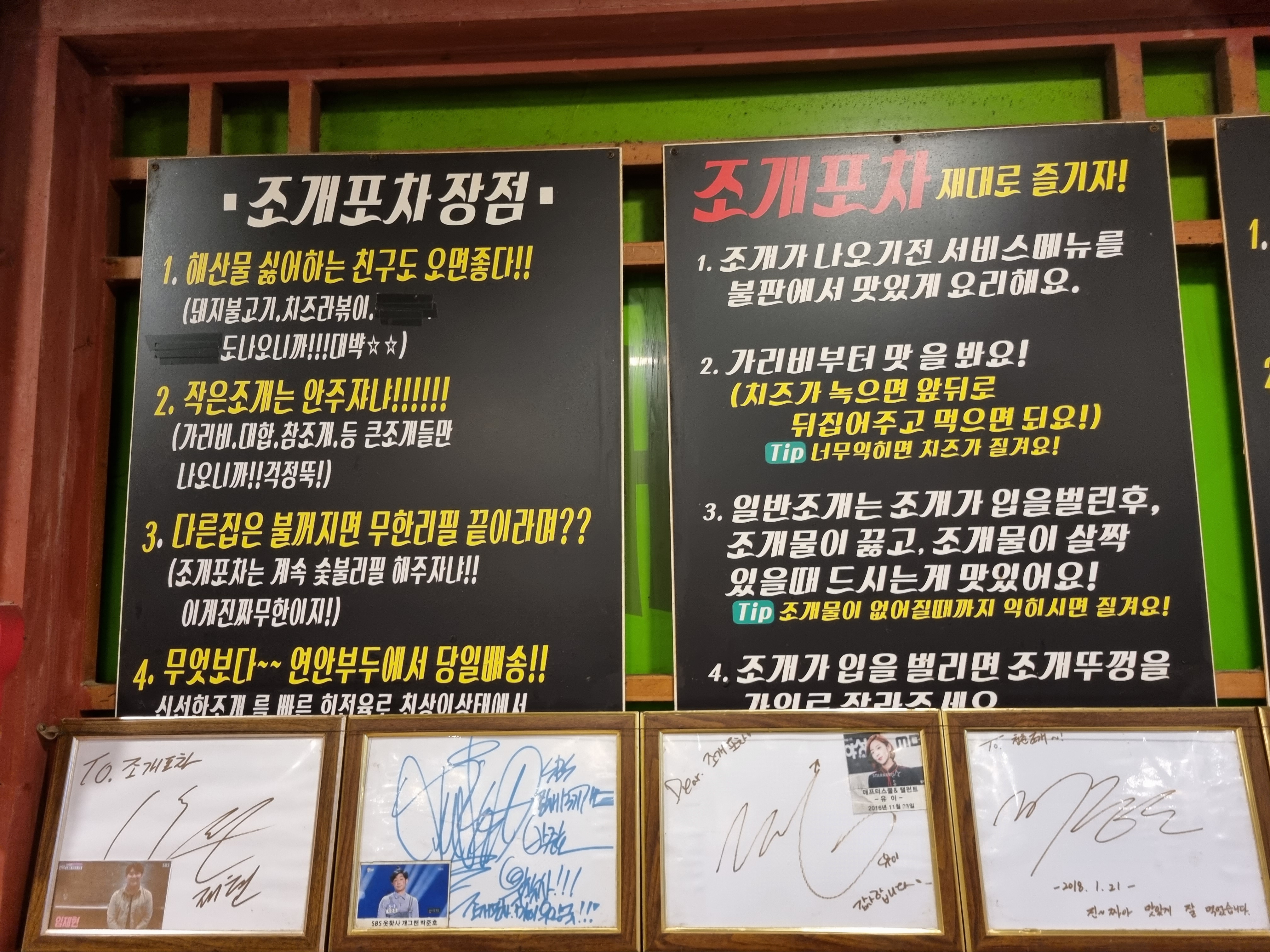 조개포차 가게의 장점과 맛있게 즐길 수 있는 방법이 벽에 안내되어 있습니다.