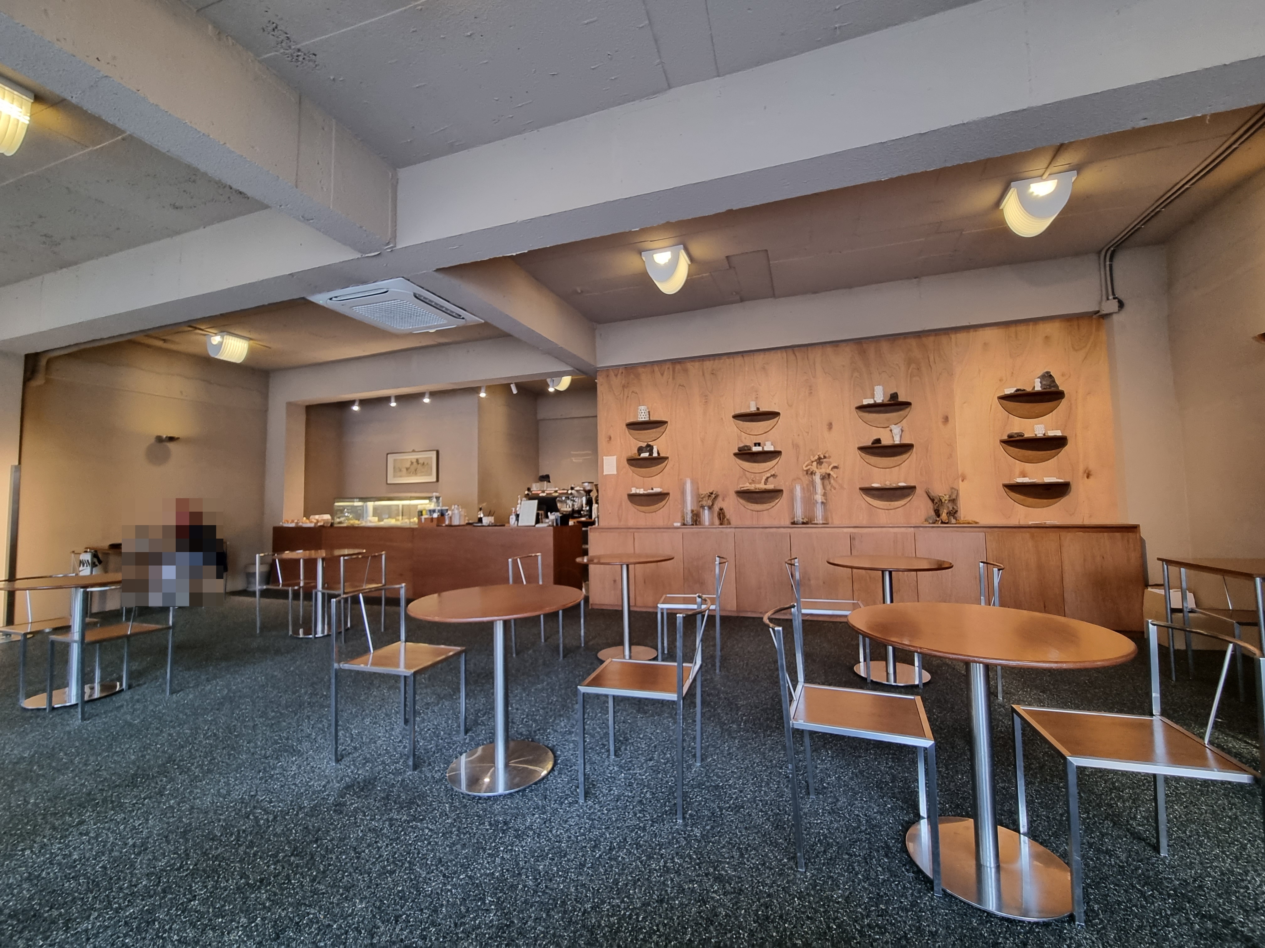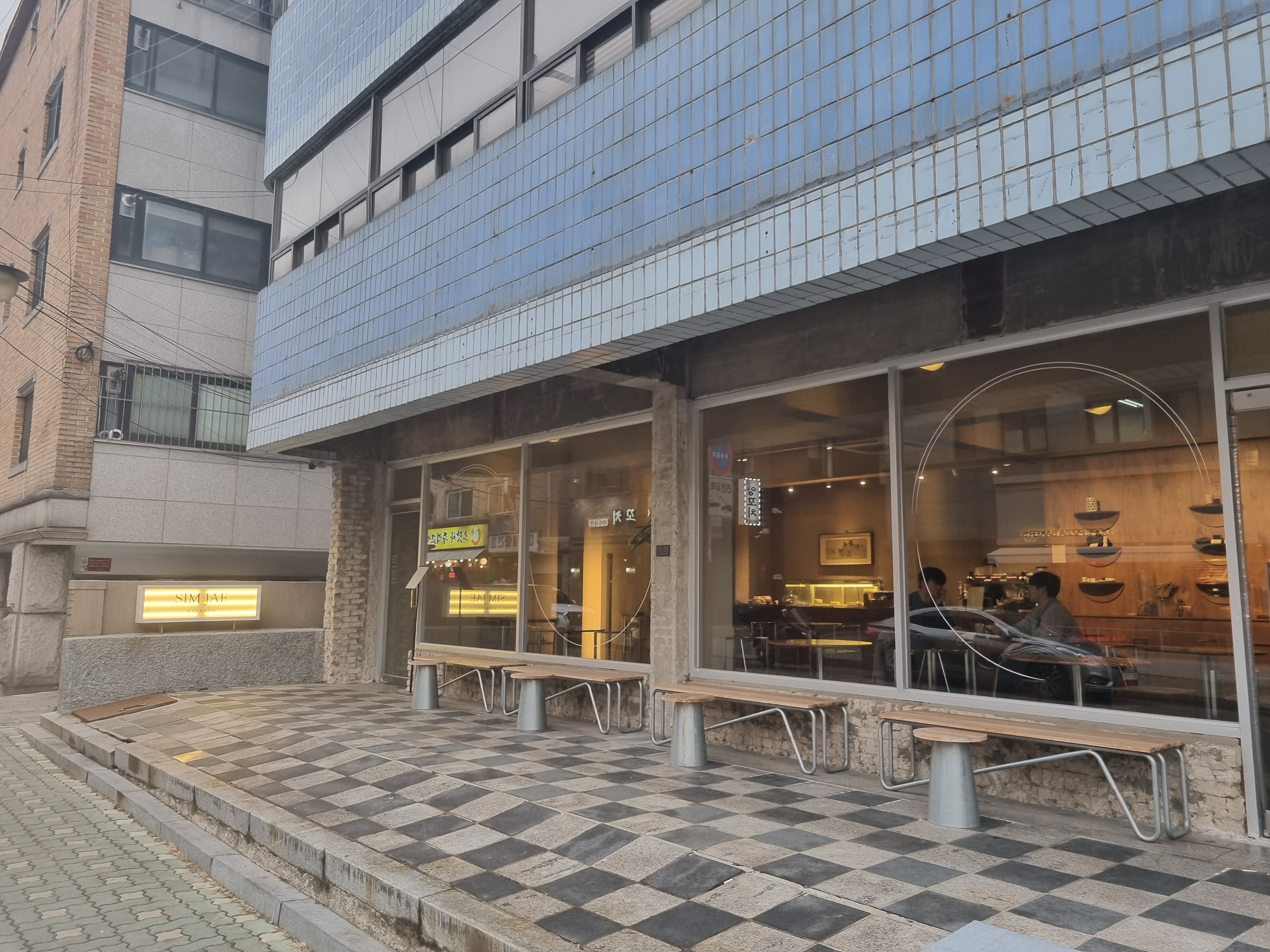 조금 오래된 상가 건물 1층에 위치해 있으며 사진에 보이는 것처럼 카페 앞에는 야외 벤치와 테이블이 하나씩 더 있습니다.