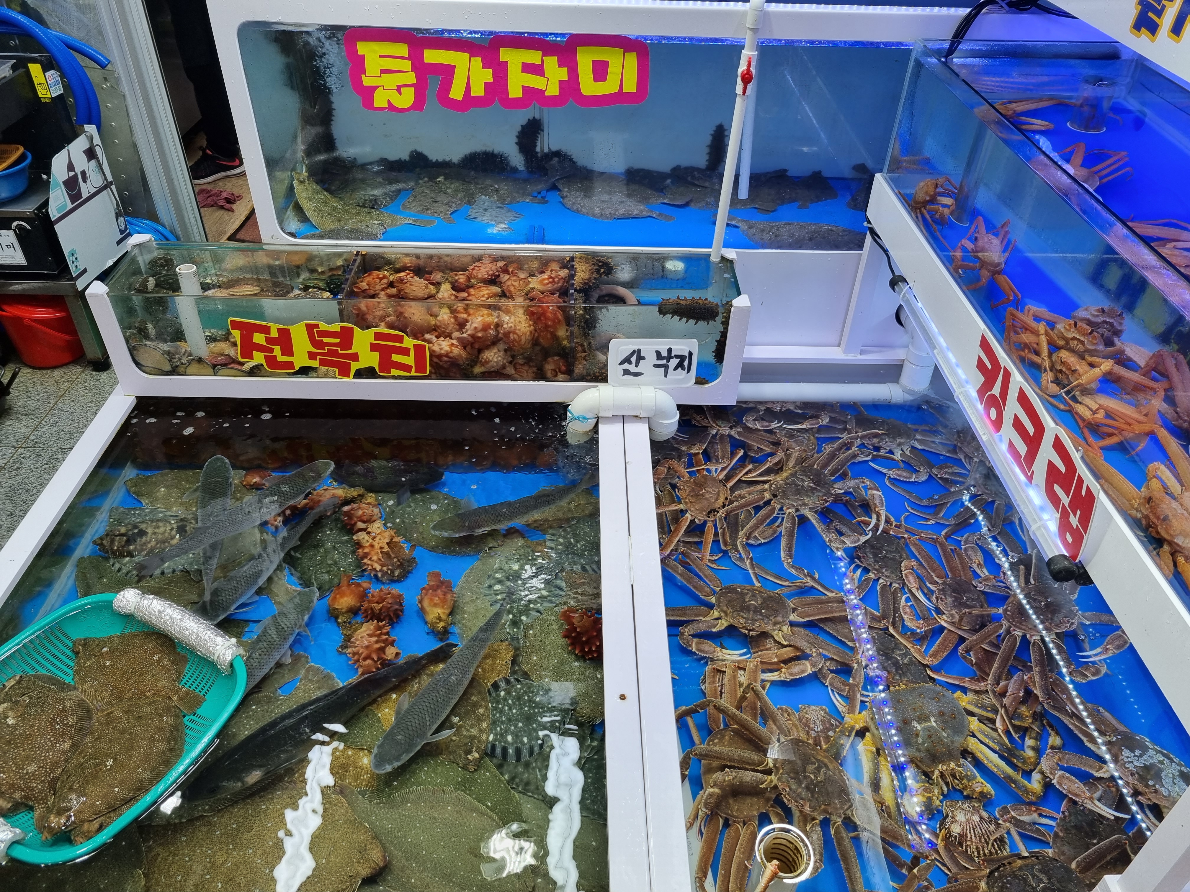 수산시장 가게답게 다양한 해산물이 판매되고 있고 킹크랩, 대게, 홍게 다양한 갑각류 종류도 있습니다.