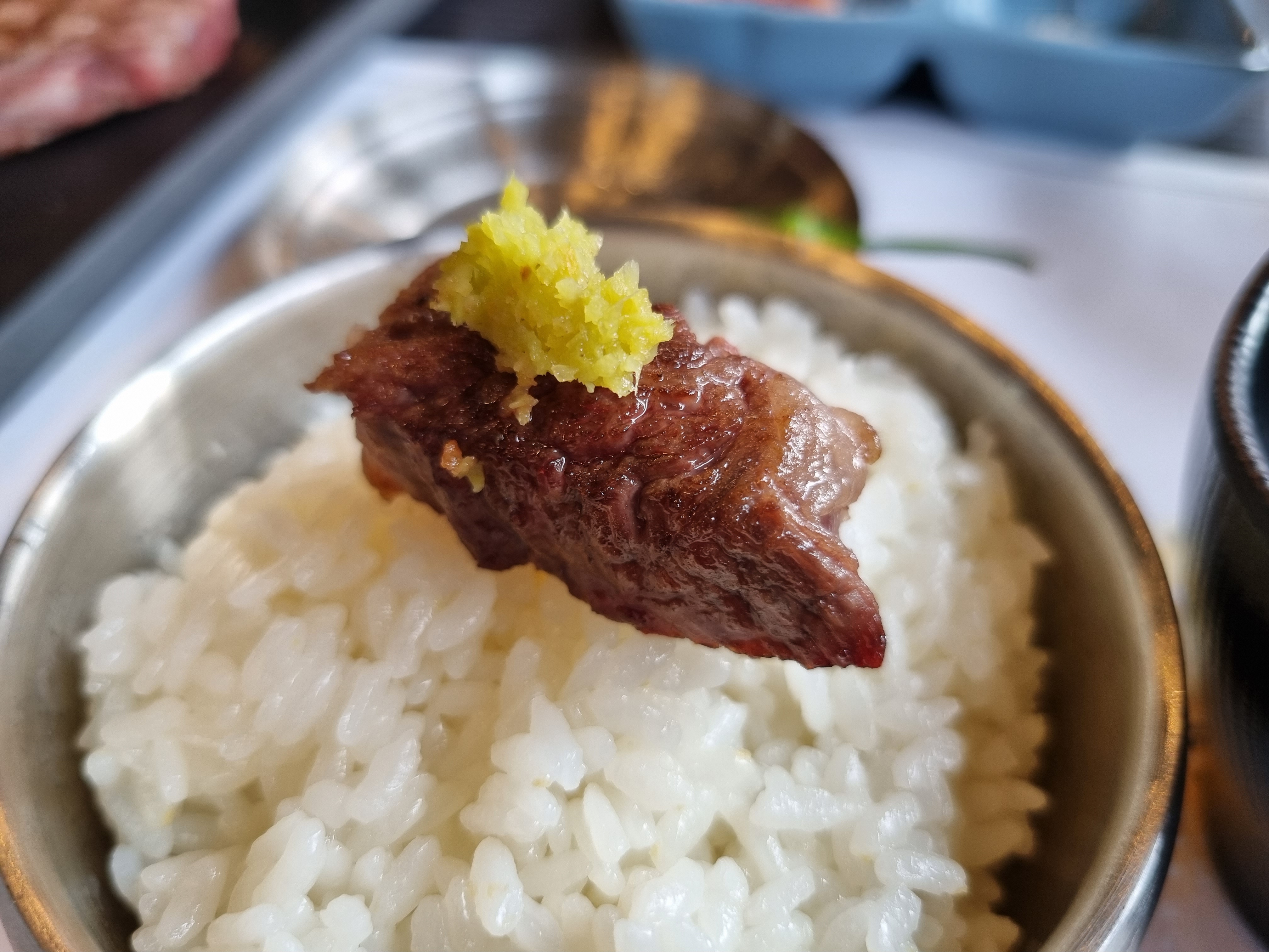 잘 구워진 등심을 와사비 살짝 올려서 야무지게 먹습니다.