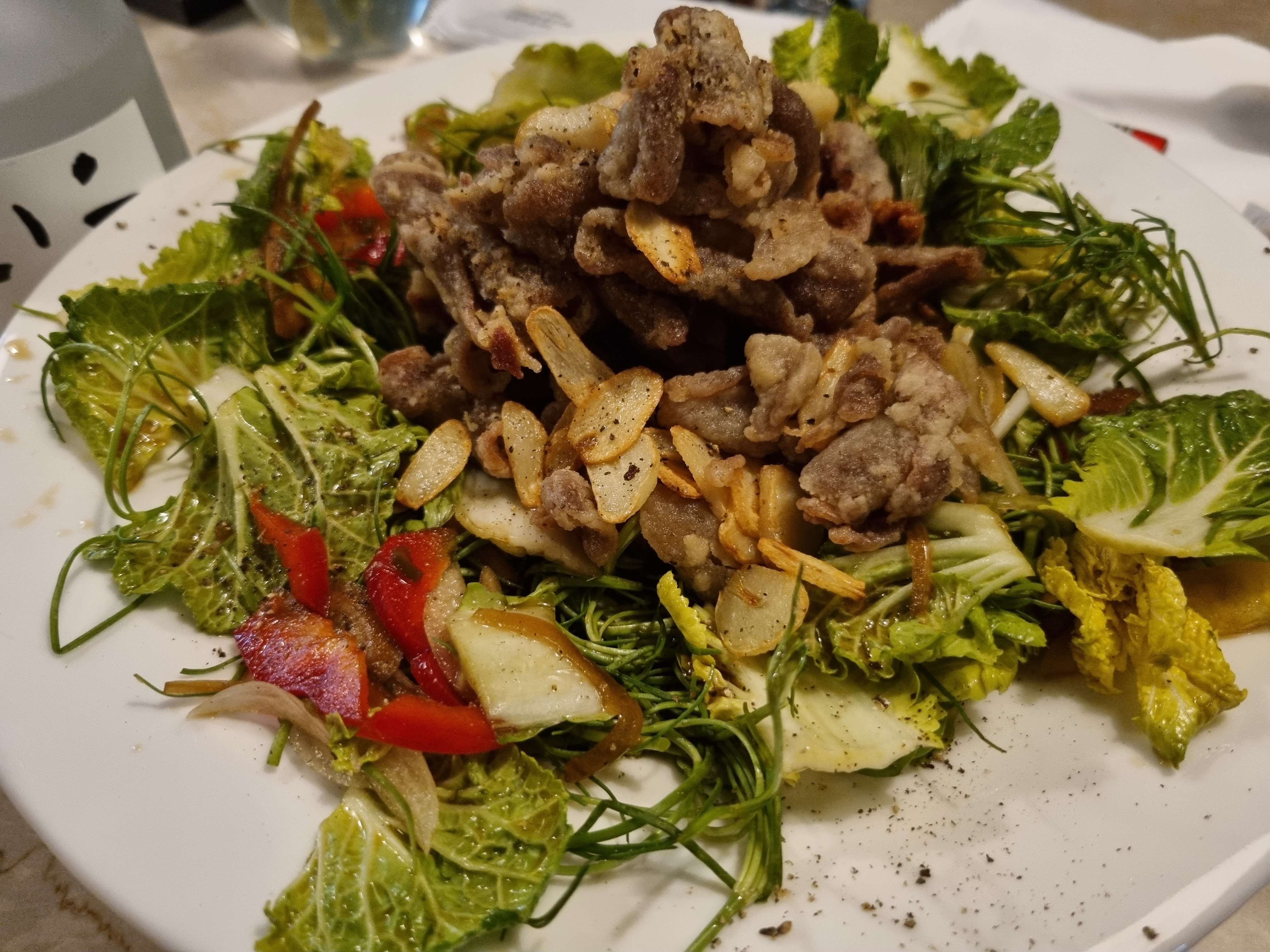 유린기 소스 (?) 비슷한 간장 베이스의 소스에 샐러드와 튀긴 고기가 함께 나옵니다.