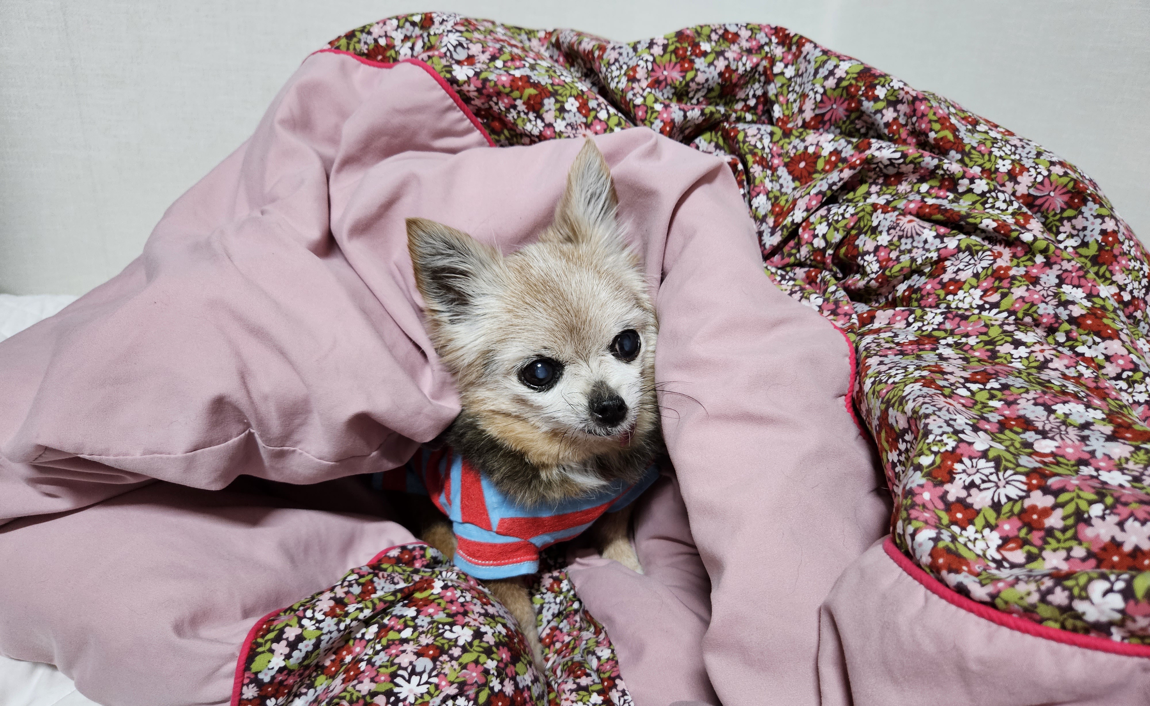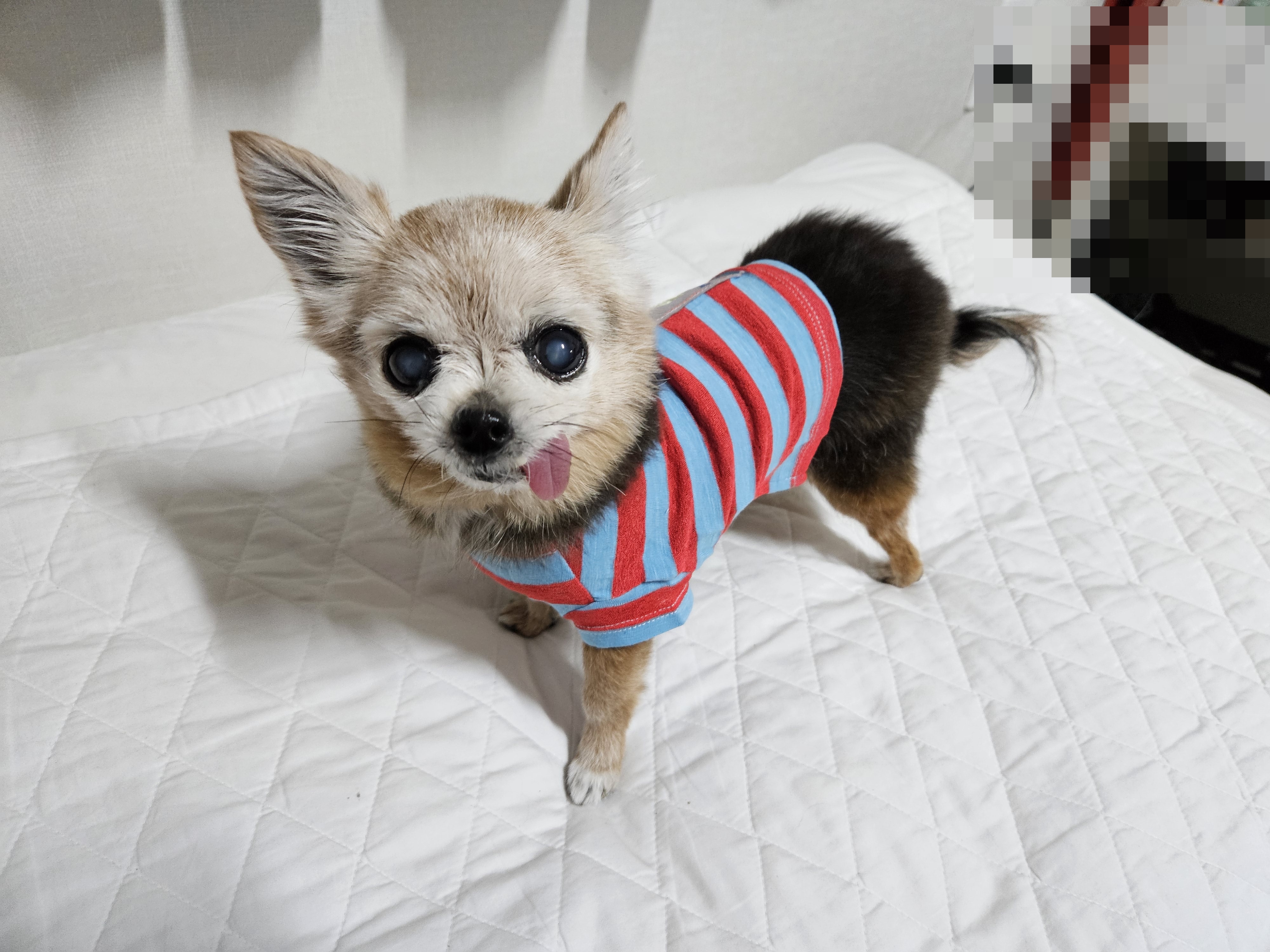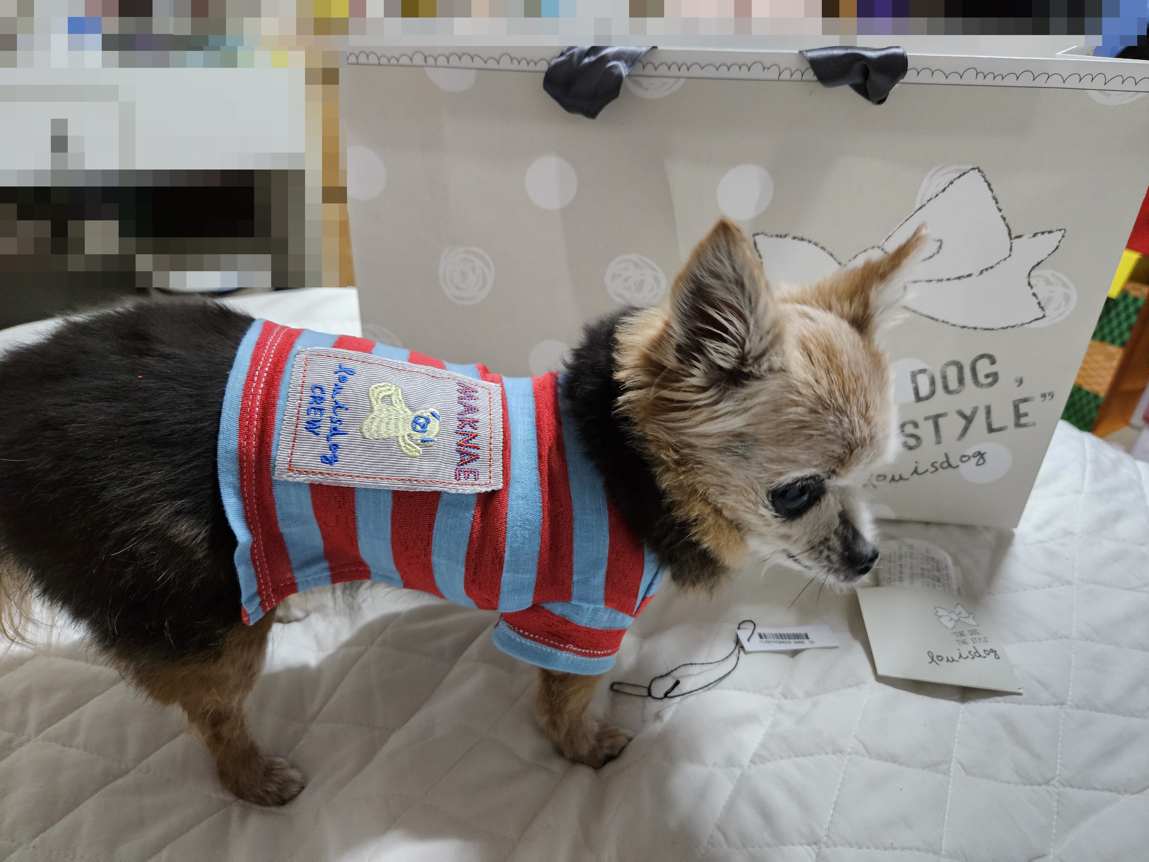 강아지 털과 잘 어울릴만한 색상의 옷을 고른 후 후다닥 왔습니다.