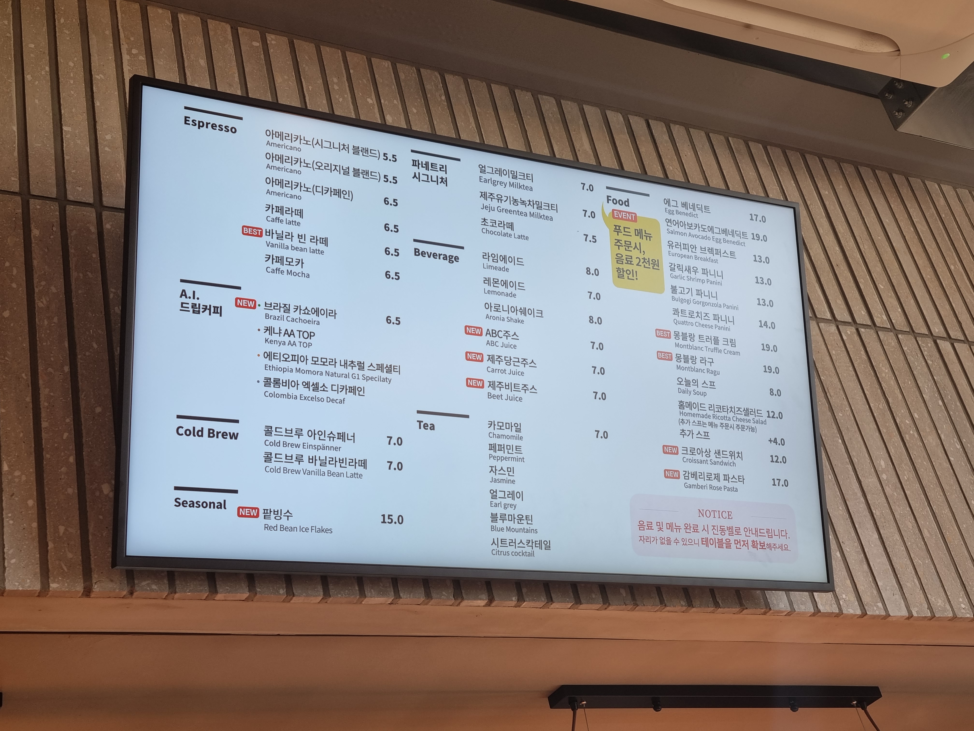 먹을 빵을 들고 놀이공원 스타일의 줄을 서서 계산대에 서면 이렇게 음료 메뉴판을 확인하실 수 있습니다.
