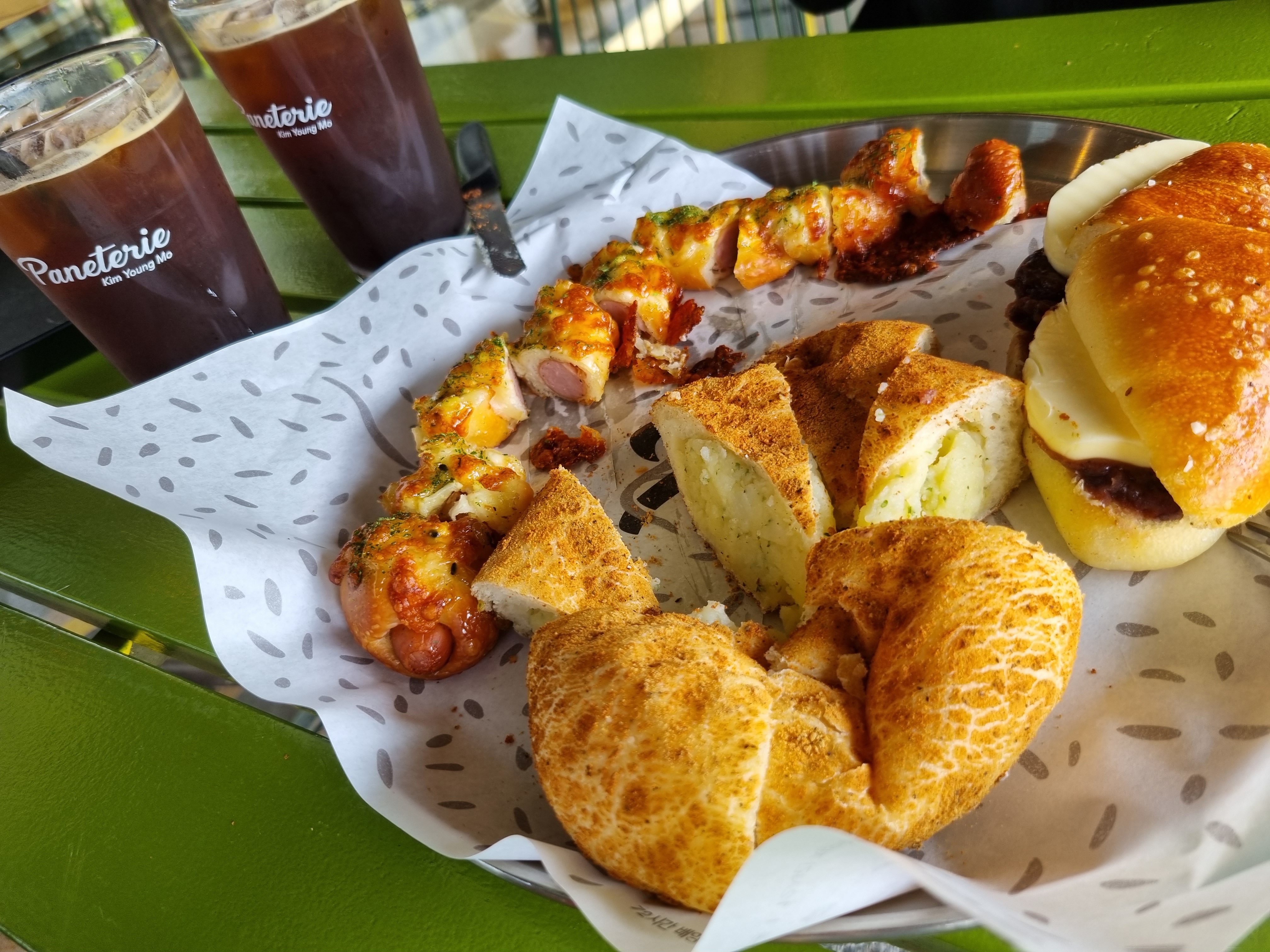 시원한 아이스 아메리카노 2잔과 뽀드득 소시지빵과 감자빵 그리고 앙버터 빵을 사서 먹기 좋게 잘라놓고 한 컷 찍어봅니다.