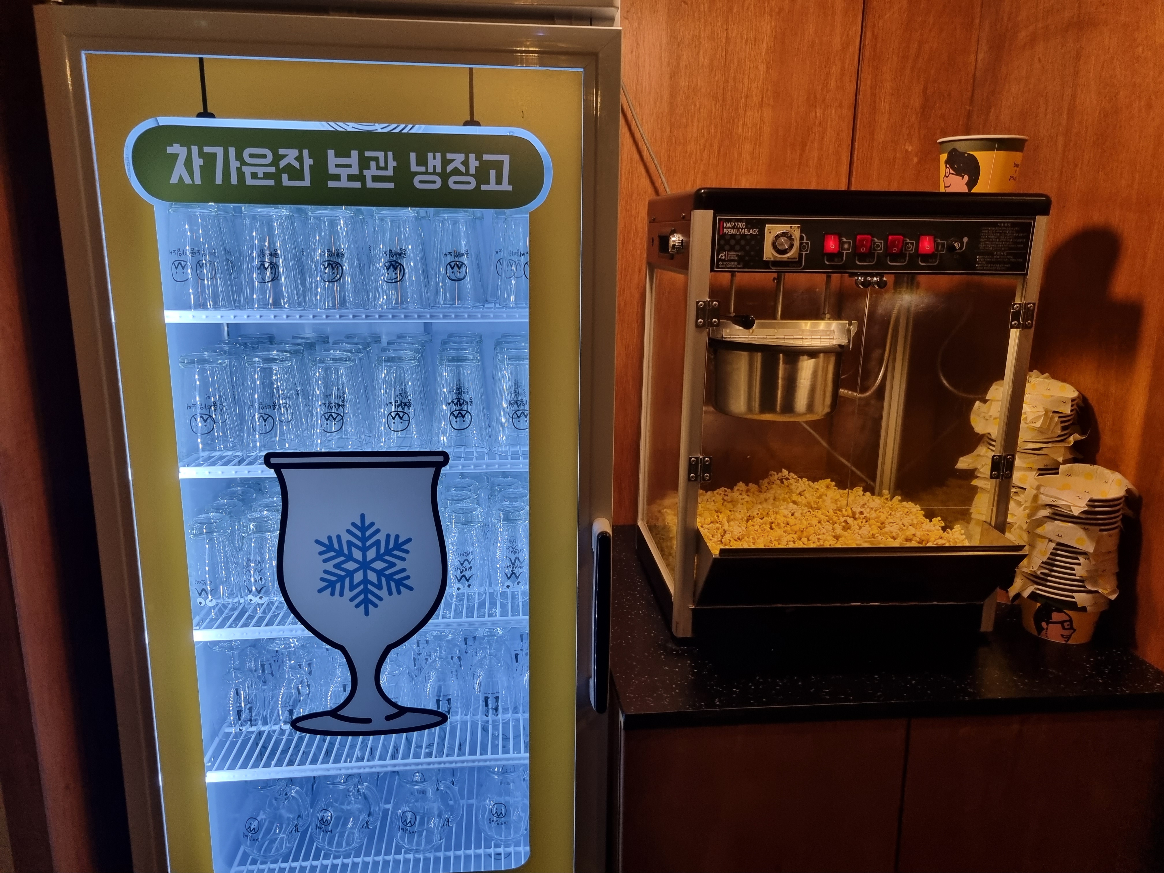 이곳에서 포크와 나이프 그리고 접시 등 필요한 물품을 필요한 만큼 챙기고 팝콘은 무한 리필이 가능하니 계속해서 가져다가 먹을 수 있습니다.