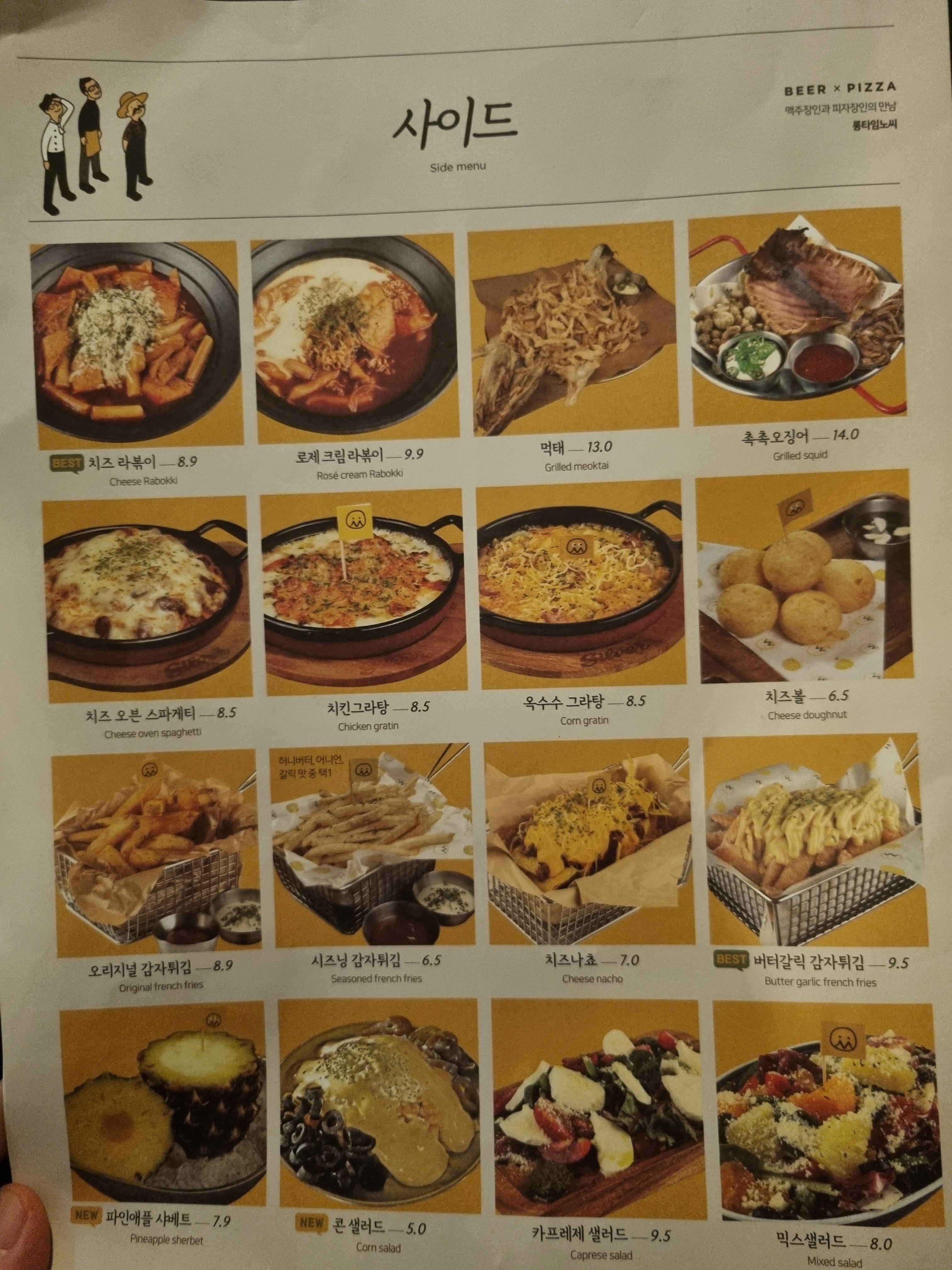 사이드 메뉴로는 치즈 라뽁이, 로제 크림 라볶이, 먹태, 촉촉 오징어, 스파게티, 그라탕, 감자튀김, 나쵸 등 먹음직스러운 다양한 메뉴가 준비되어 있습니다.
