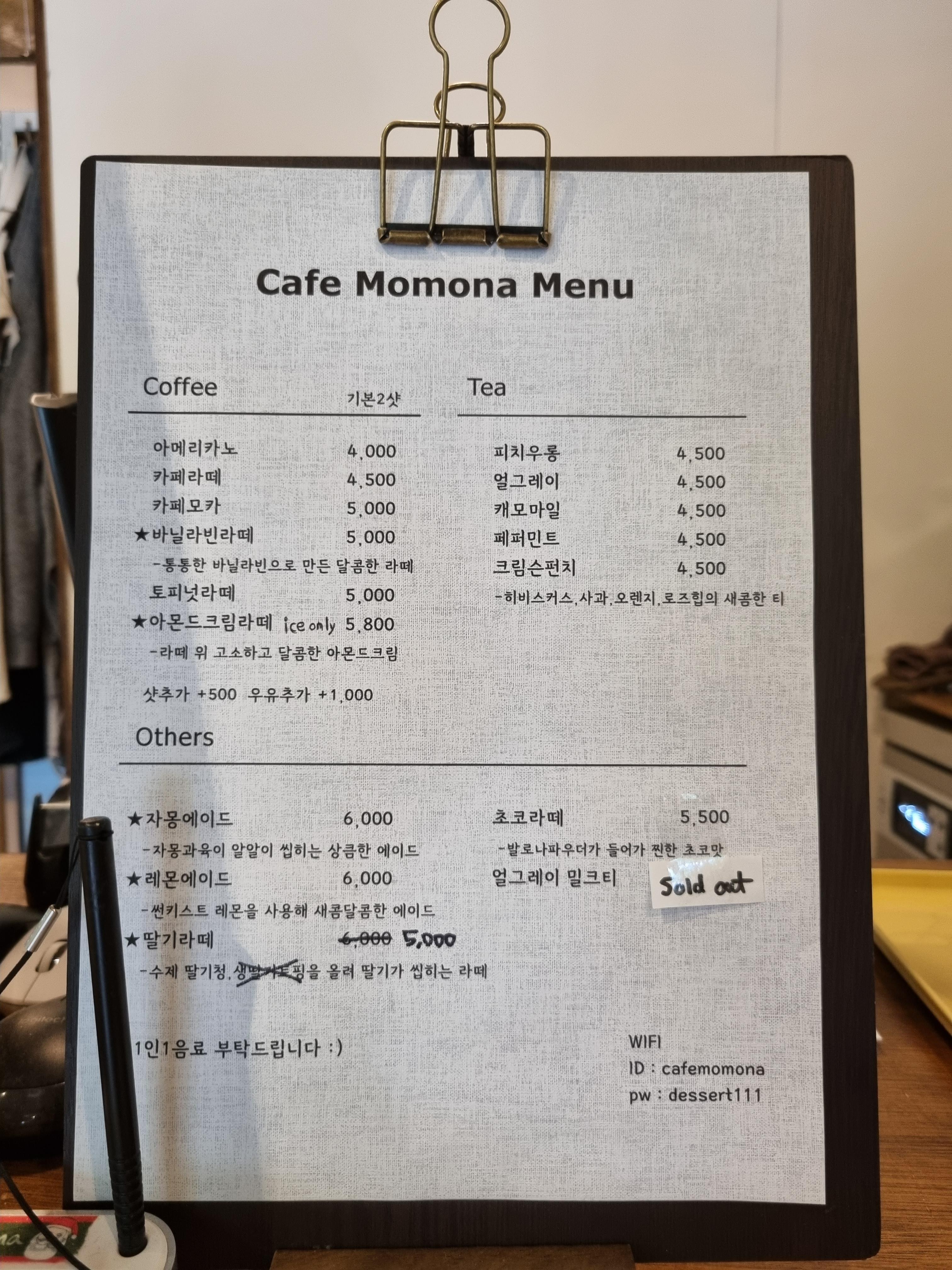 카페모모나 메뉴입니다.