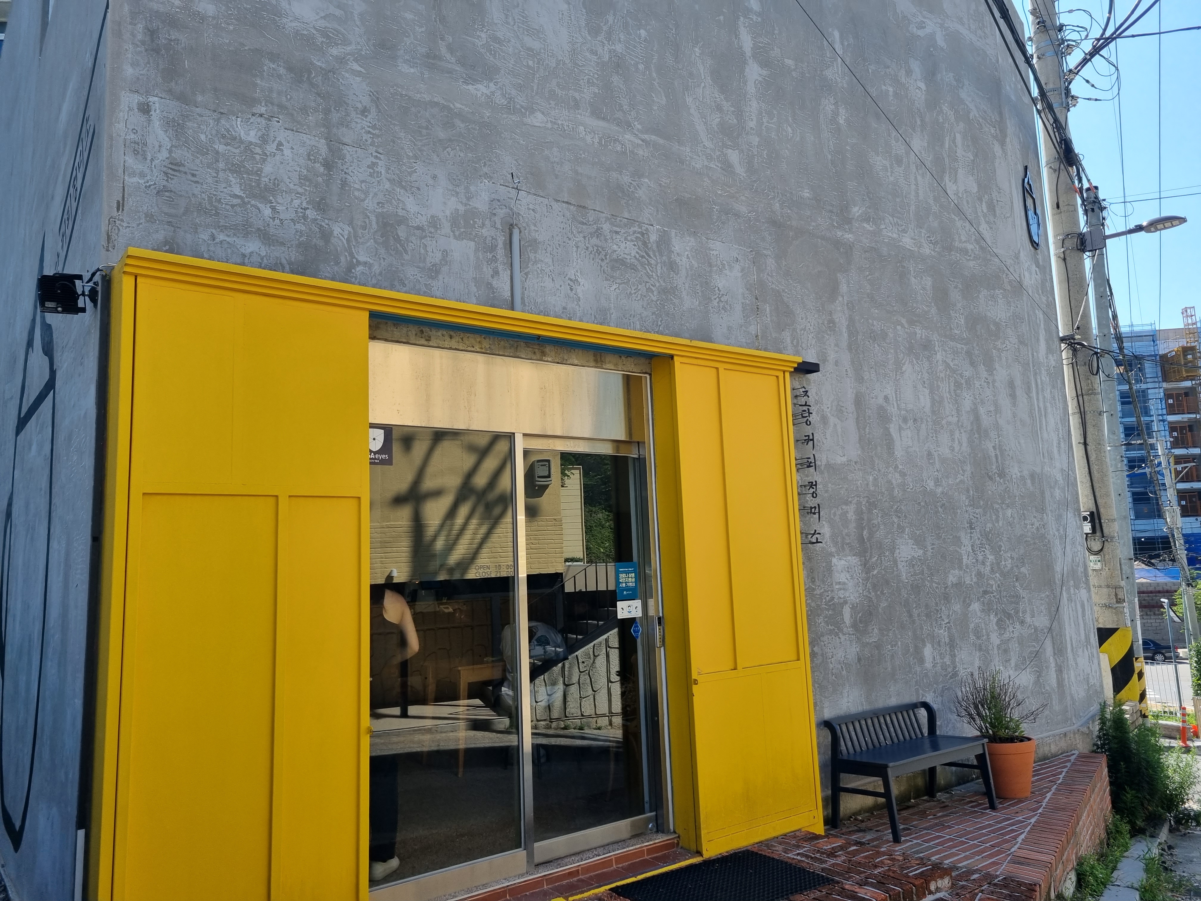 건물 외부는 회색 바탕이고 입구쪽에 노란색으로 포인트를 줘서 심플하고 깔끔하고 이쁩니다.