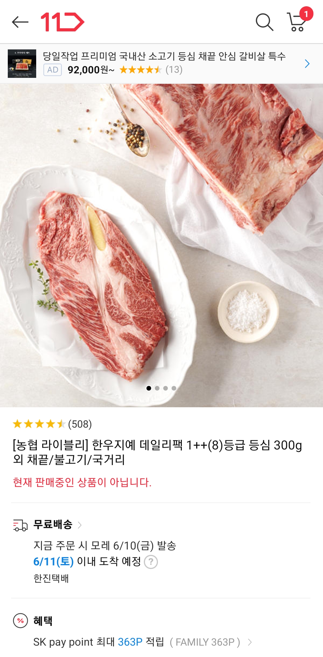 11번가 쇼킹딜 농협 라이블리 한우지예 투뿔 등심 구매 후기