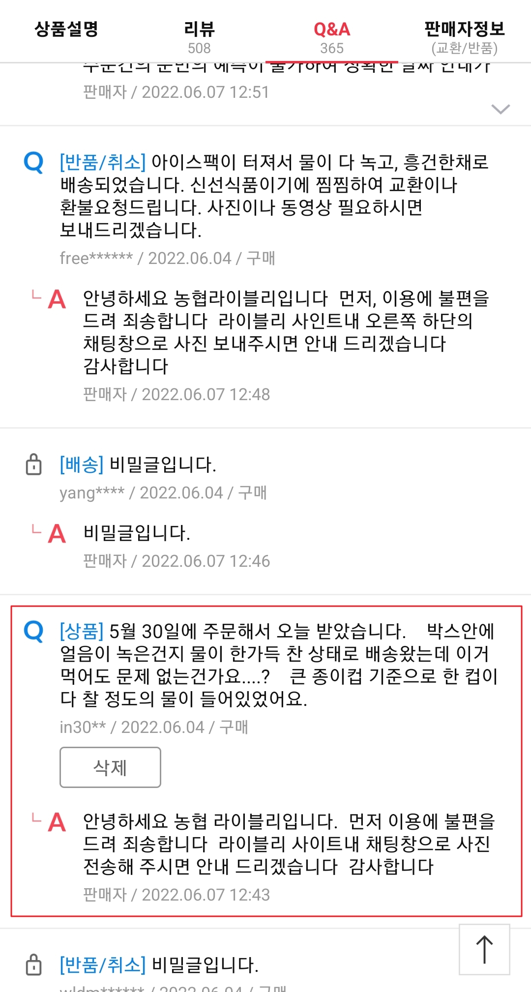 물론 쇼킹딜로 인해 배송 지연 등 수 많은 문의가 쏟아졌겠지만 아이스팩이 터진건지 정체 모를 물이 박스안에 가득한데 그거에 따른 구체적인 설명은 아무것도 없고 그냥 먹어도 됩니다~ 라는 답변 너무 황당하네요.
