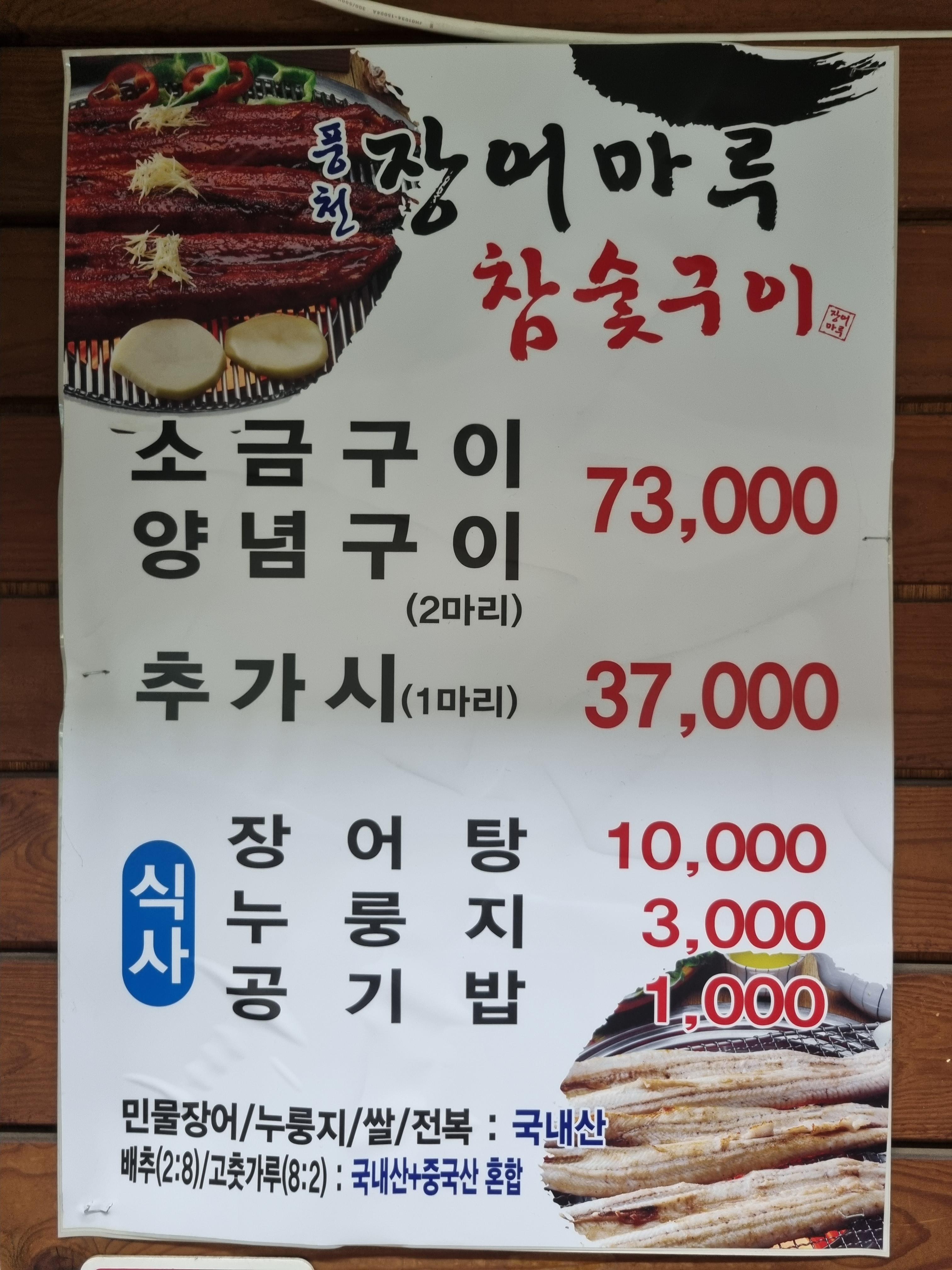 순수 국내산(국내산 치어사용 > 양식 > 최고가) 최상의 민물장어만을 재료로 사용한다고 합니다.