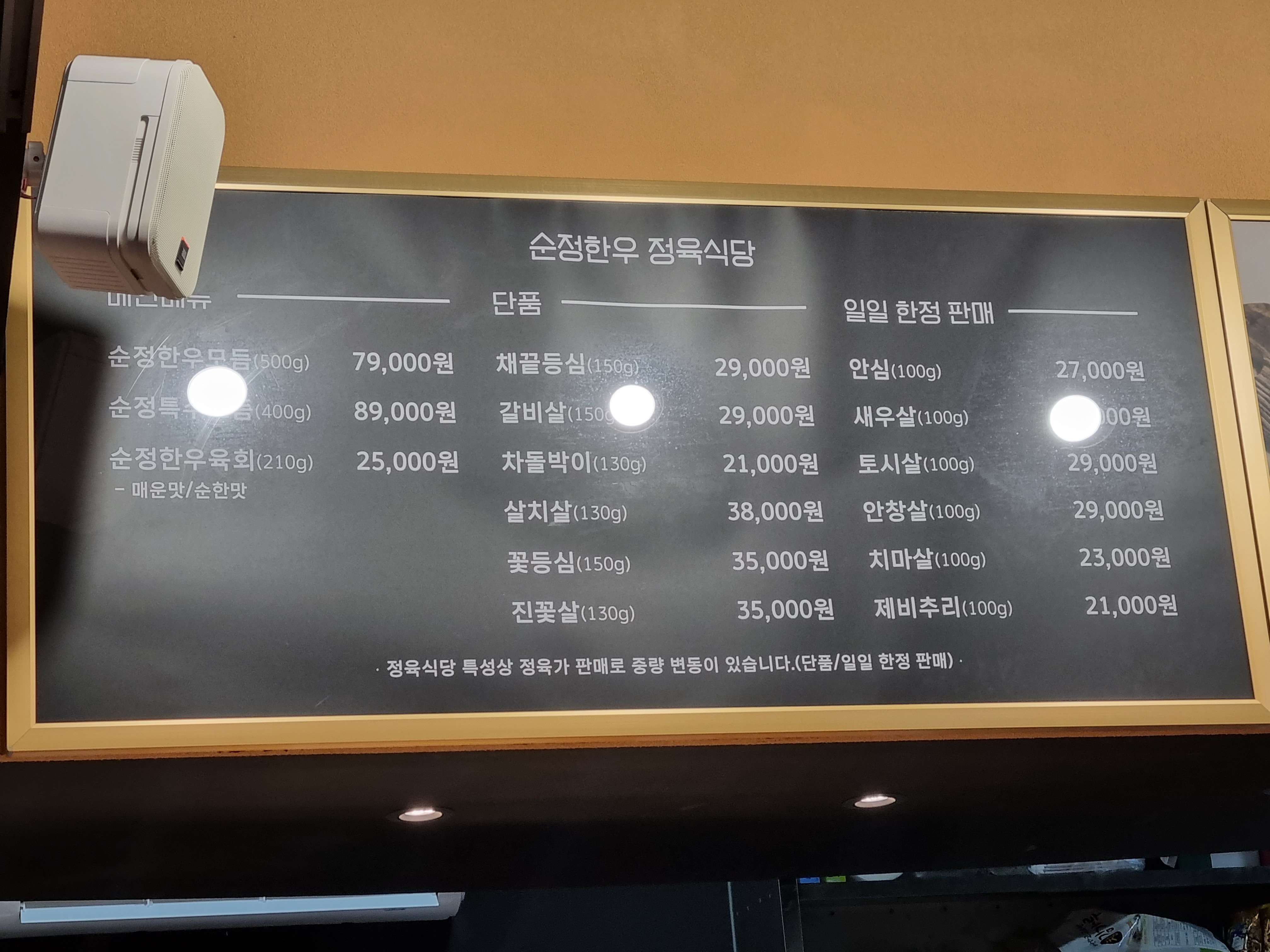 순정한우 메뉴입니다.