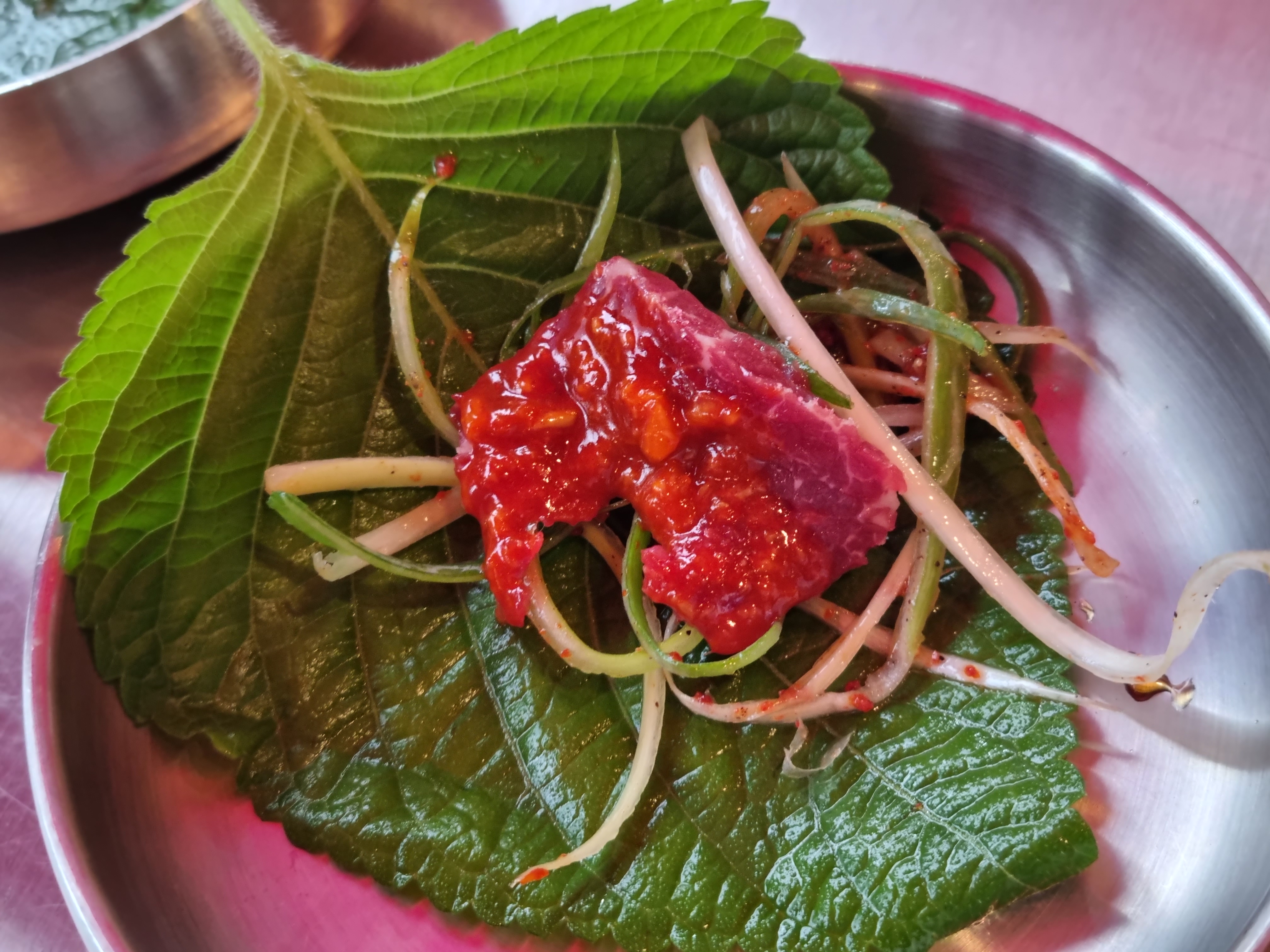 육사시미를 깻잎에다가 파무침과 함께 쌈을 싸서 먹어도 맛있습니다.
