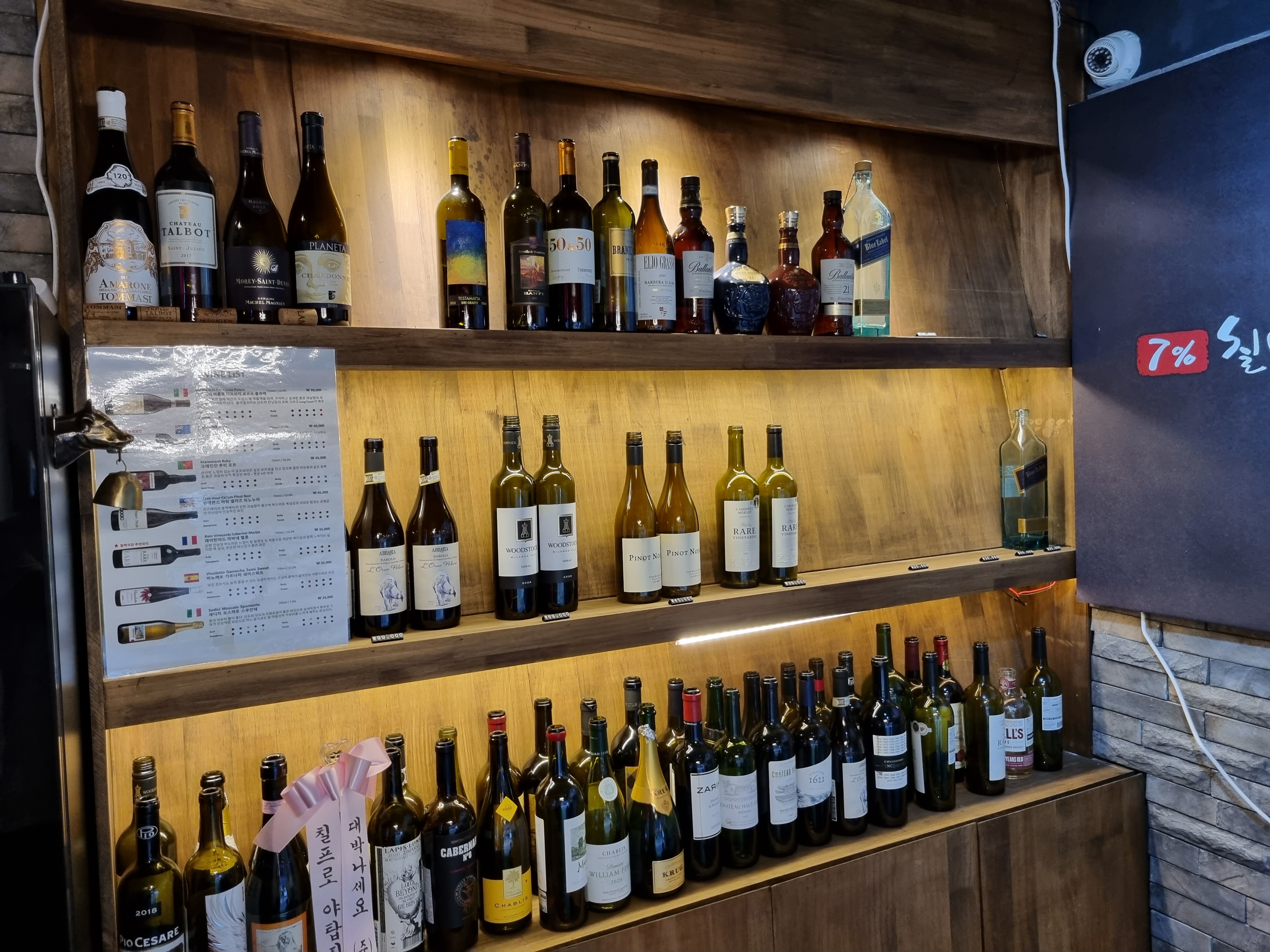와인도 함께 판매하는 소고기집이다보니 가게를 들어서면 이렇게 와인이 전시되어 있는데 먹고 남은 병들을 인테리어삼아서 전시해놨습니다.
