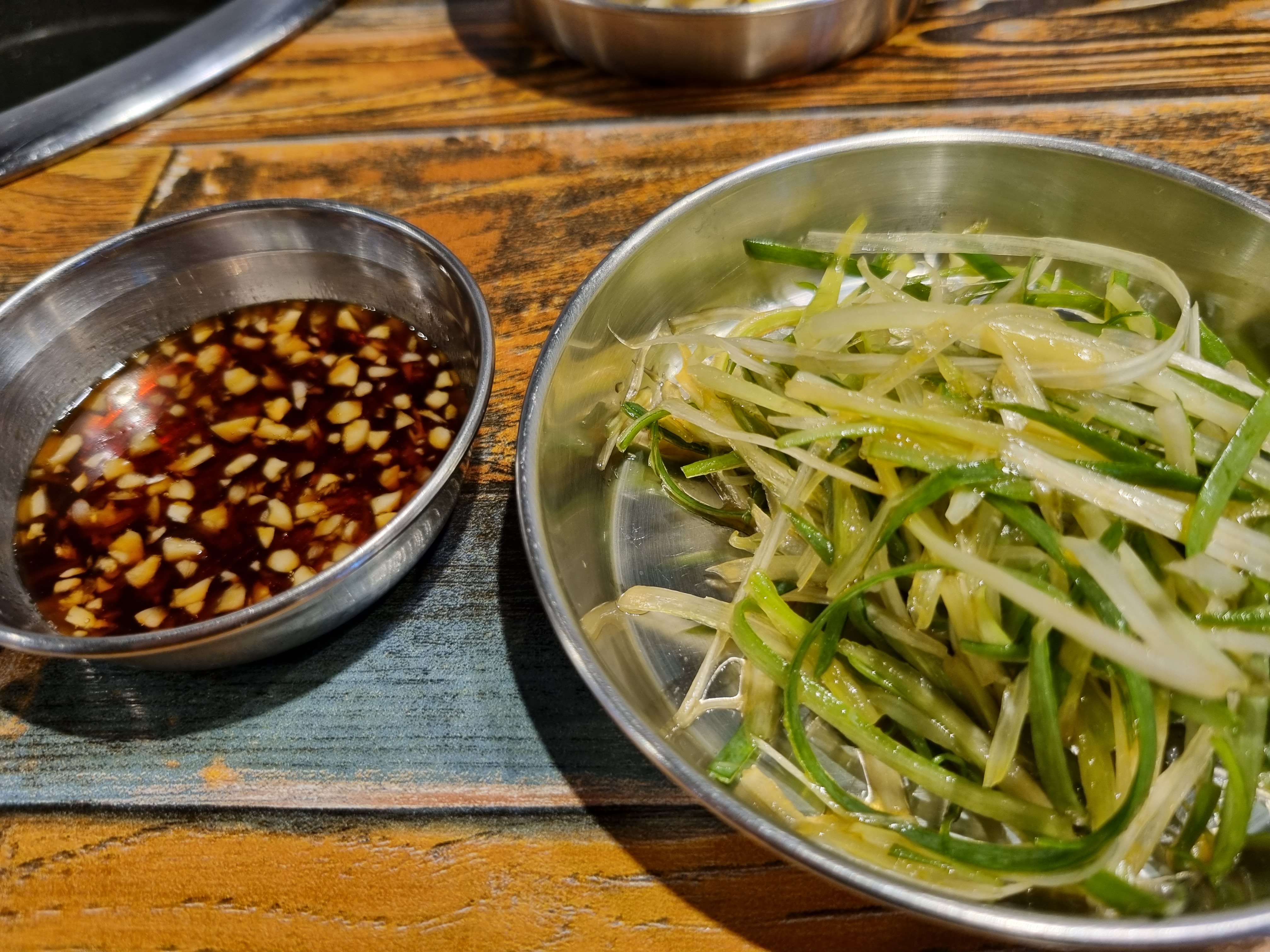 돼지갈비를 더욱 더 맛있게 먹을 수 있게 만들어주는 소스와 파채입니다.