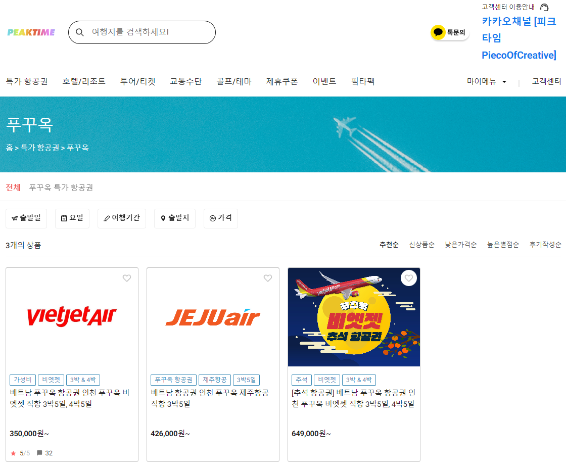베트남 푸꾸옥에서 한국 사람들한테 아주 유명한 업체가 피크타임이라는 곳인데 피크타임 홈페이지를 통해서 항공권과 숙박 및 투어를 모두 예약할 수 있습니다.
