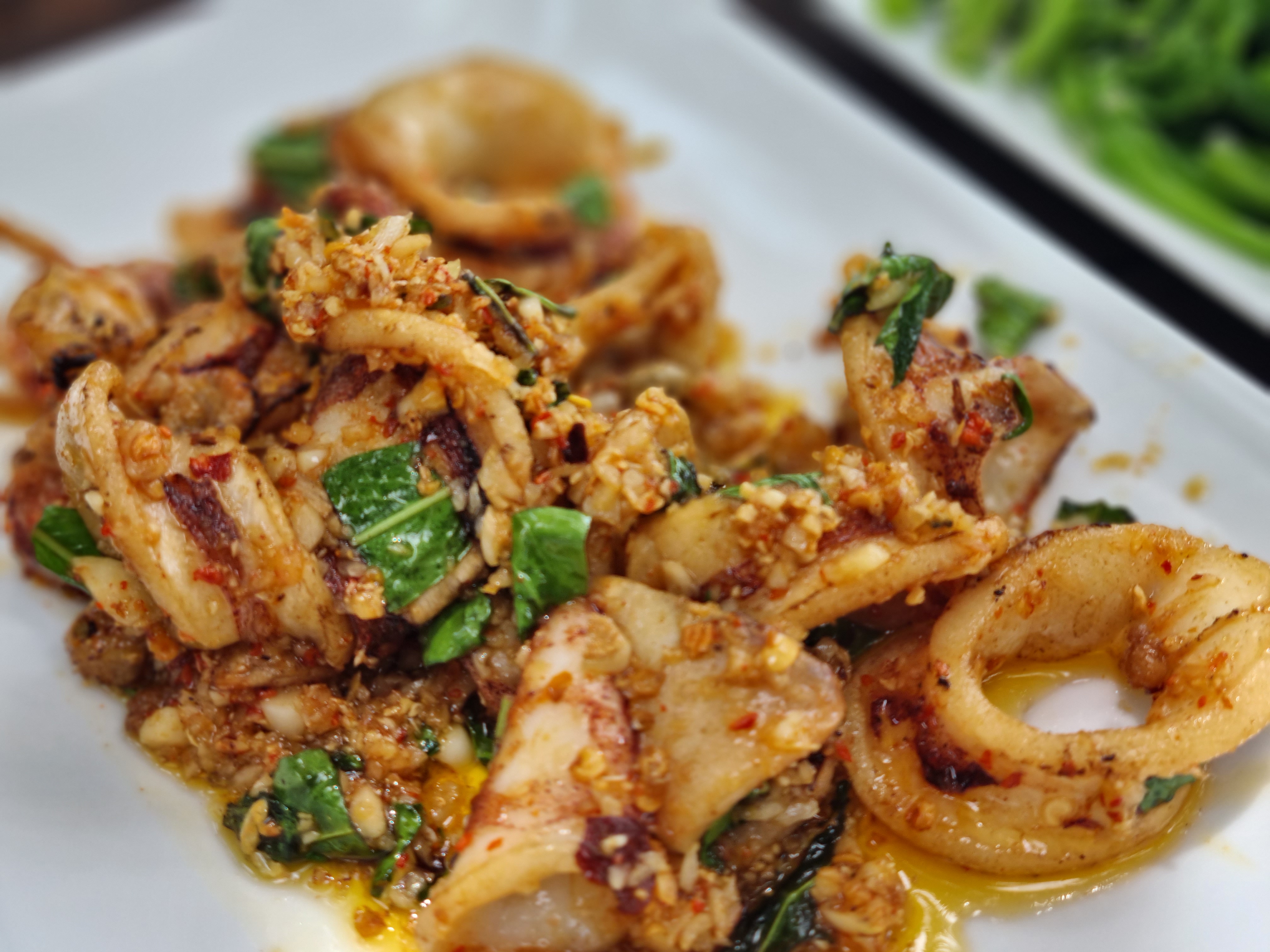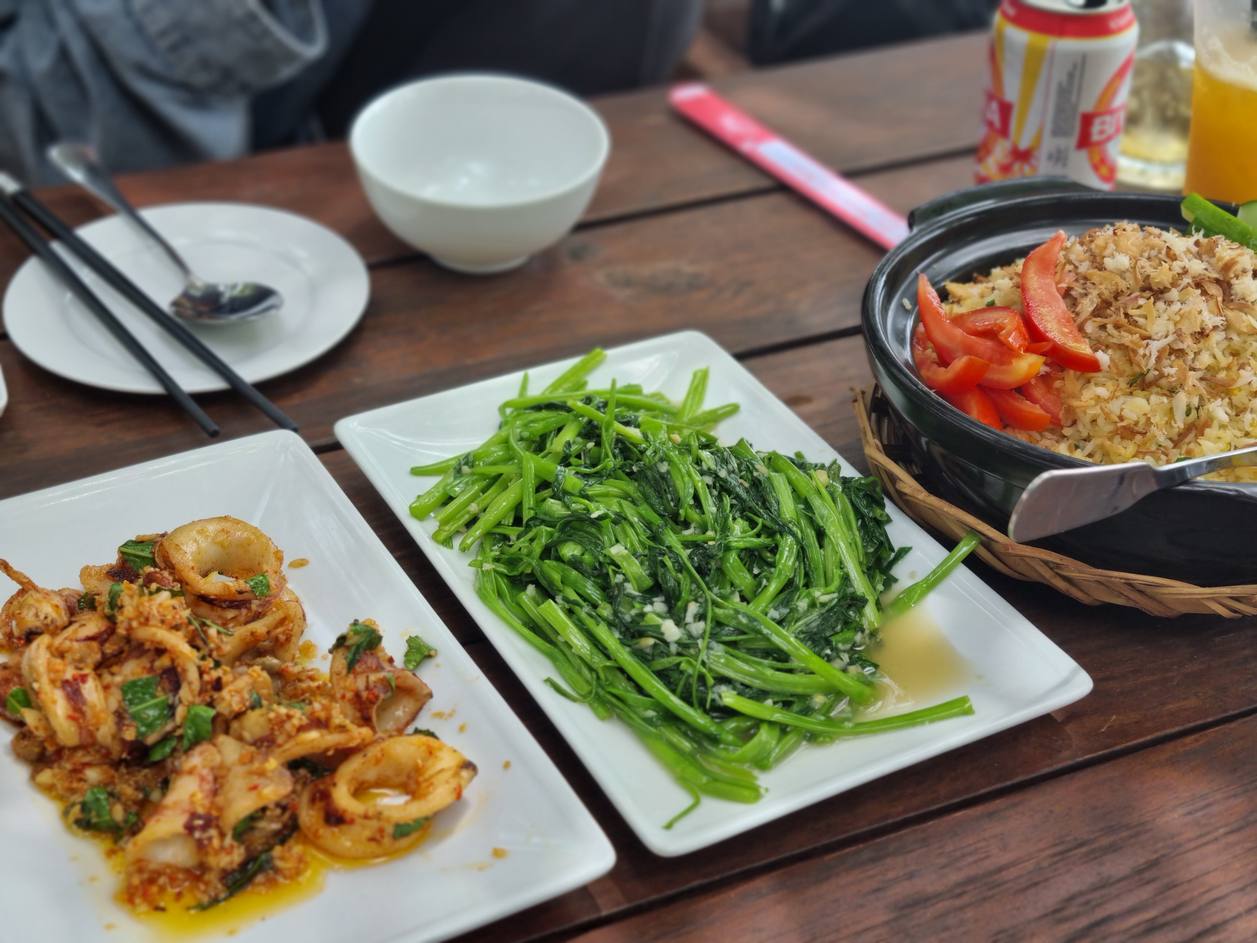 저는 볶음밥 1개, 모닝글로리 볶음 1개, 무슨 뭐시기 오징어 1개 그리고 망고 요거트와 콜라, 맥주를 주문했습니다.