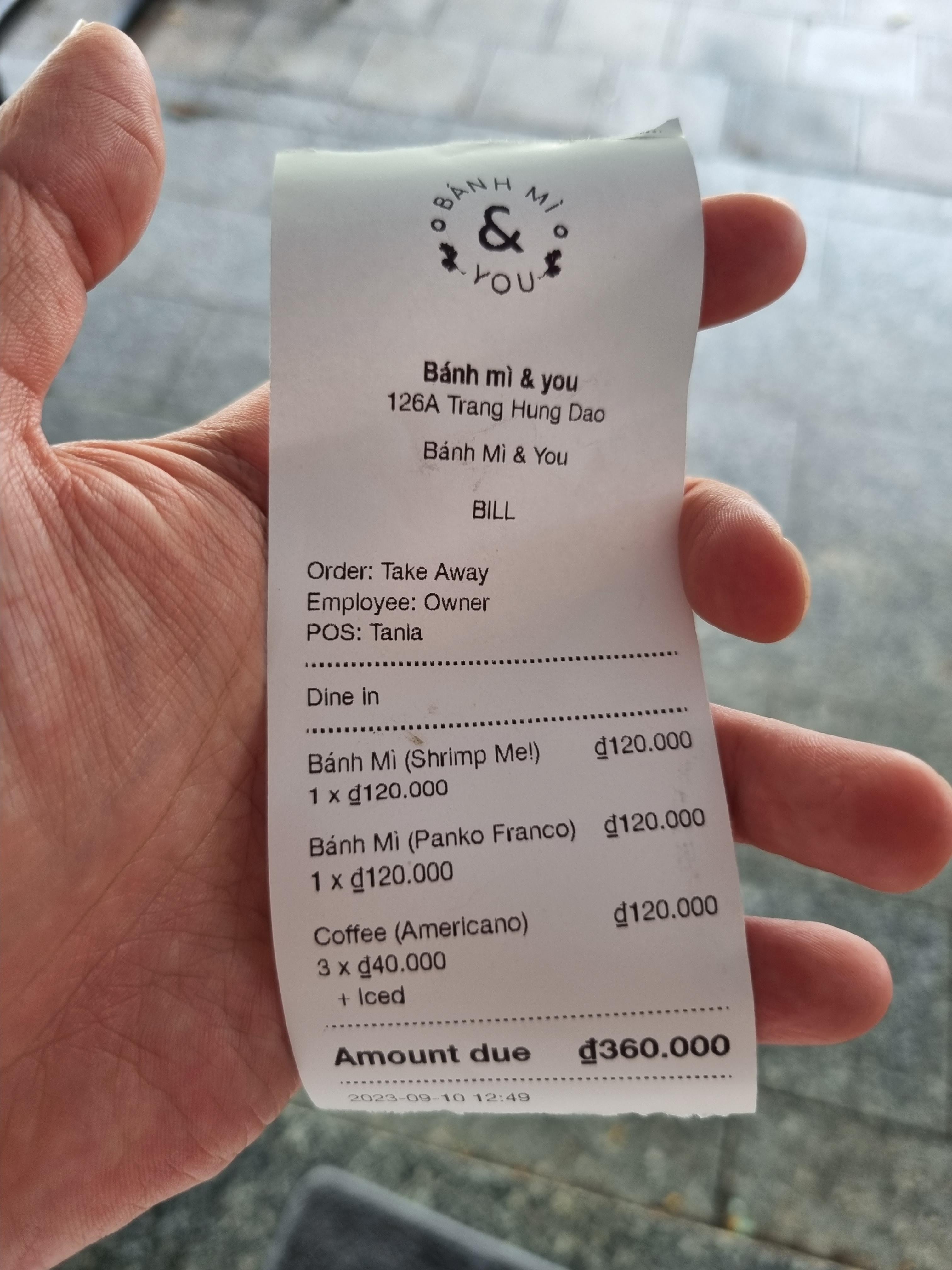 반미 샌드위치 2개 그리고 아이스 아메리카노 3잔해서 총 360,000 동