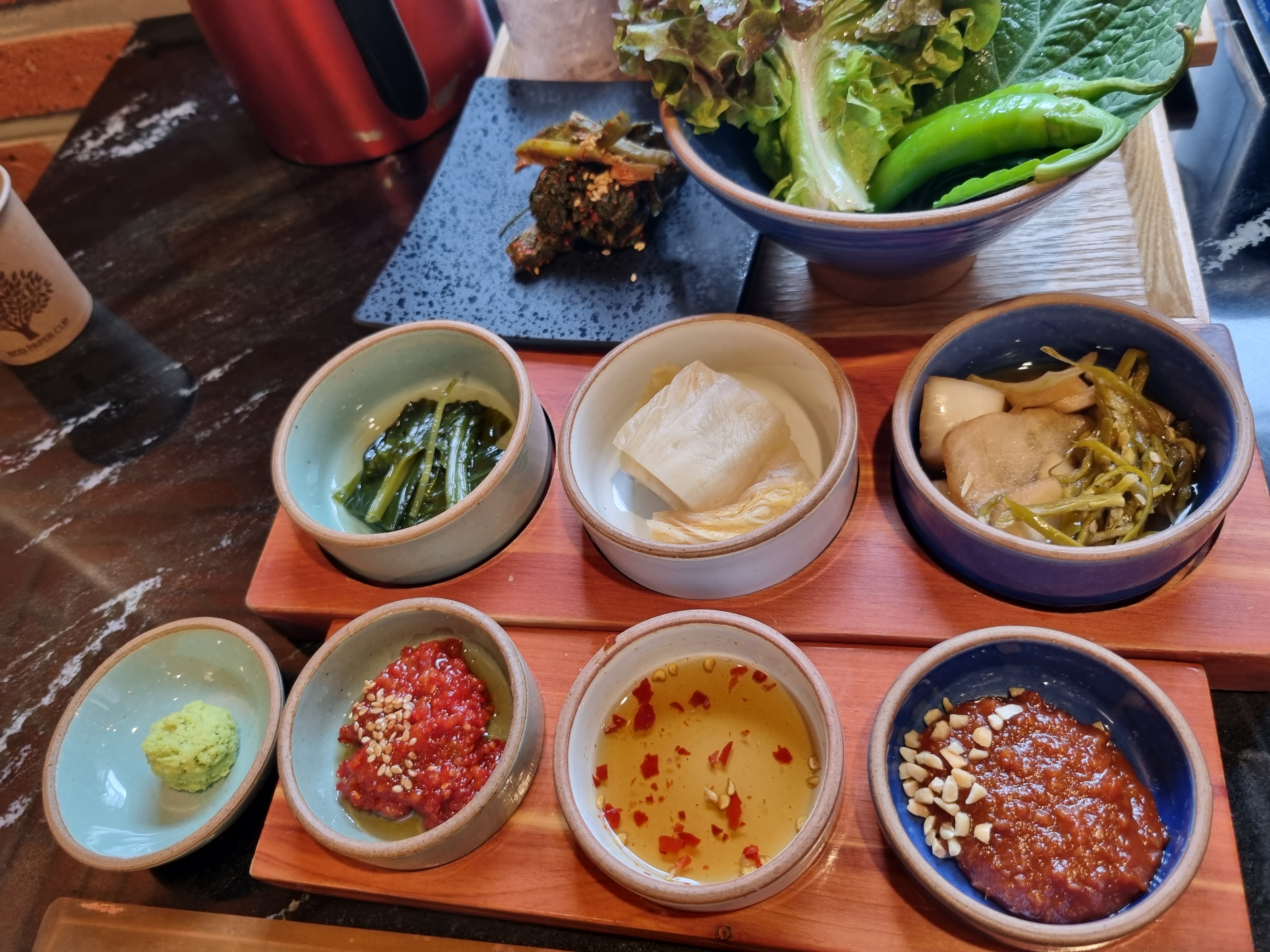 소금을 비롯해 쌈장, 와사비, 무슨 젓갈 등 여러 소스와 함께 아주 맛있게 먹었습니다.