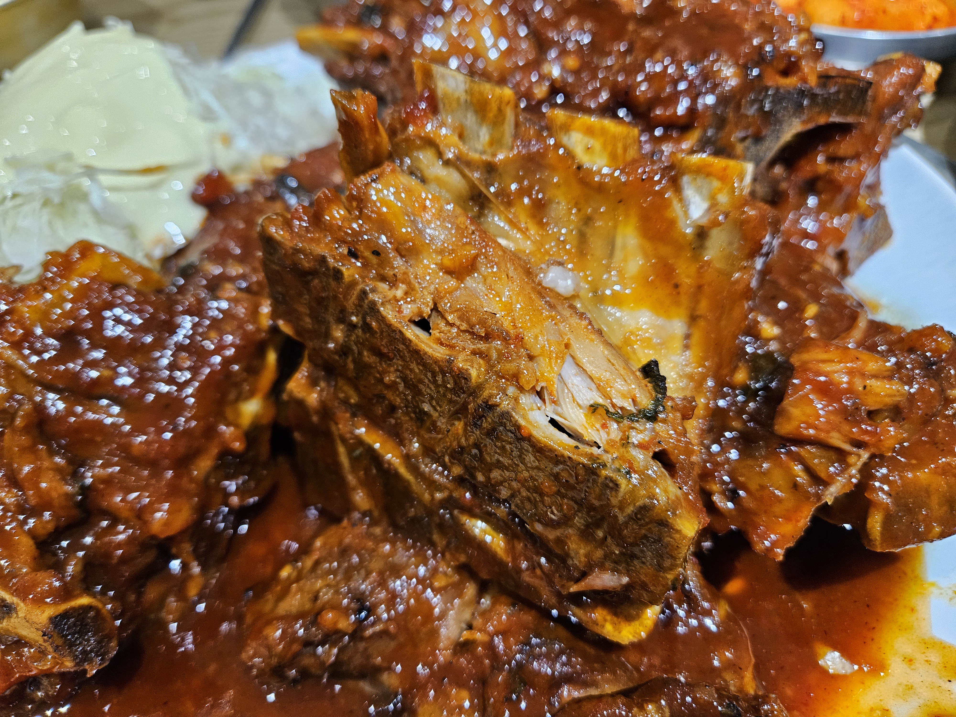 감자탕이나 뼈해장국에 나오는 고기를 빨간 양념에 비벼서 구워 나오는 이 맛있는 음식은 처음 먹어보는 맛이었습니다.