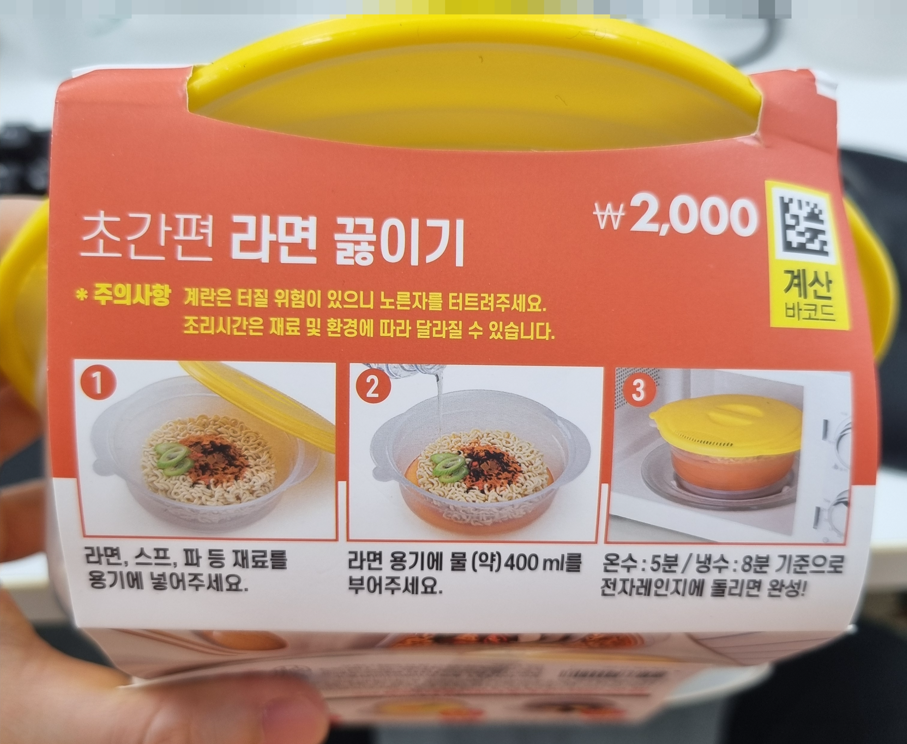 라면재료와 함께 400ml 정도의 물을 용기에 넣고 전자레인지에 돌리기만 하면 되는데 400ml 맞추기가 조금 애매합니다.
