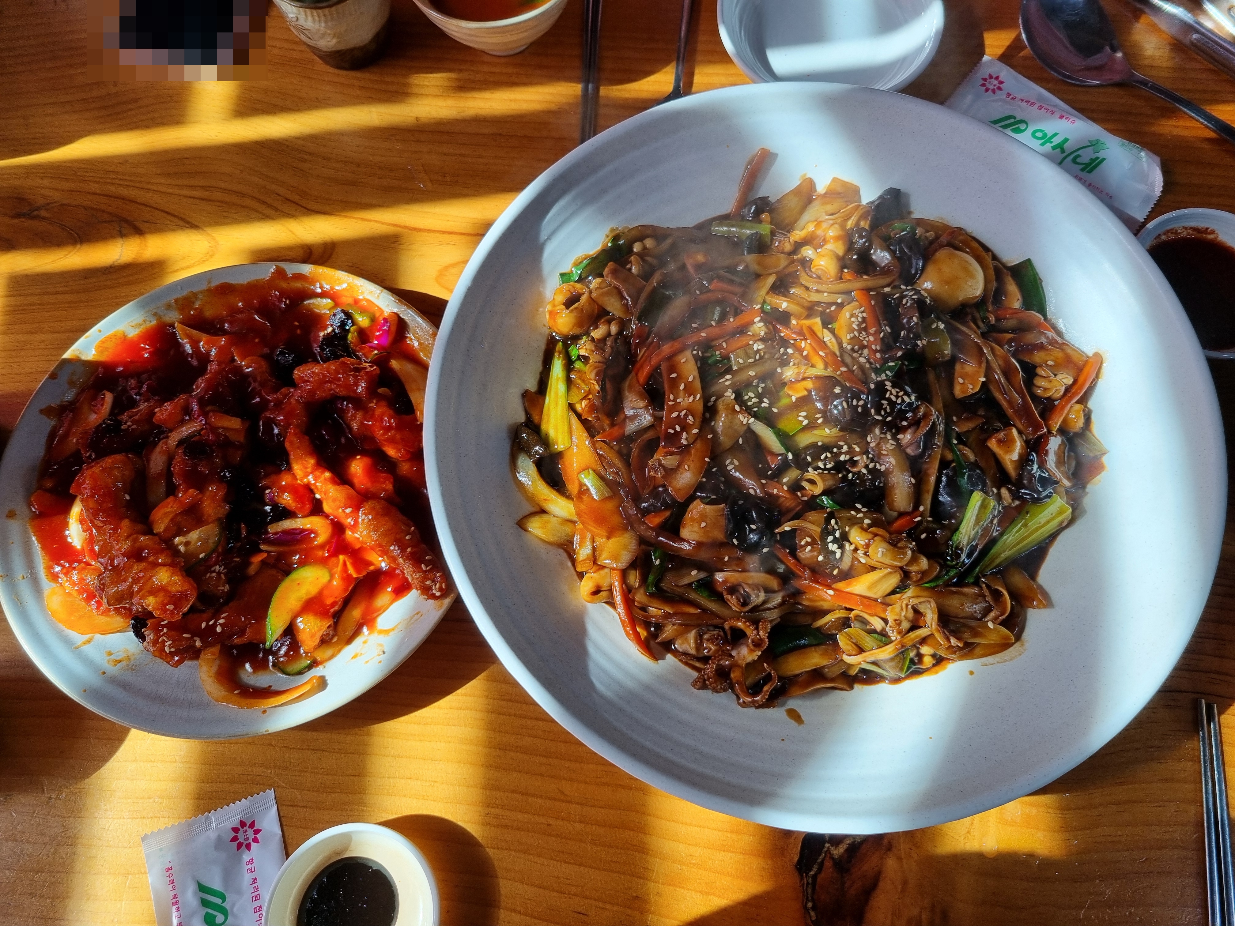 쟁반짜장(2인)과 칠리탕수육입니다.