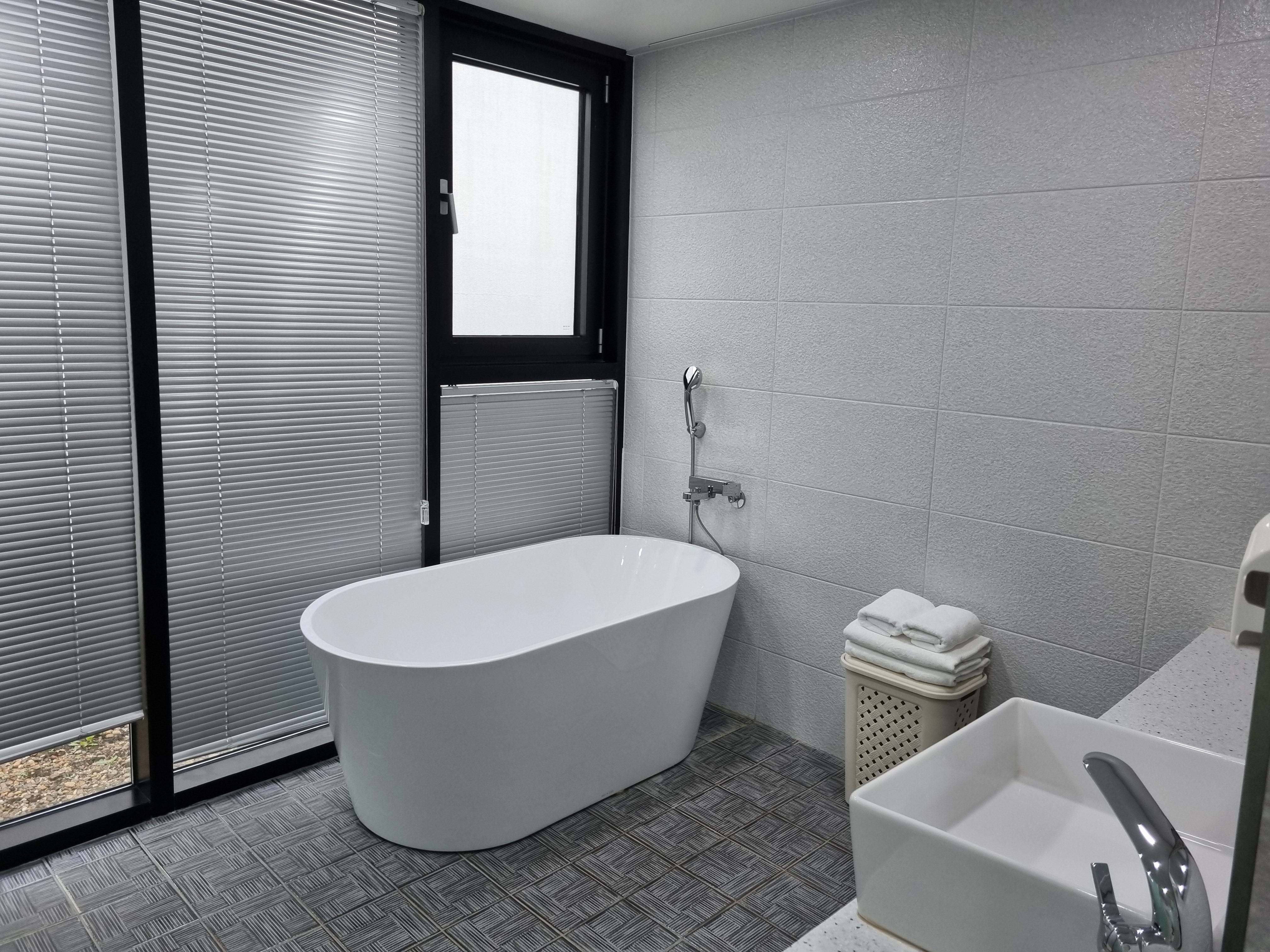 그냥 자연스럽게 쓱 들어가면 이렇게 욕조와 세면대가 있습니다.