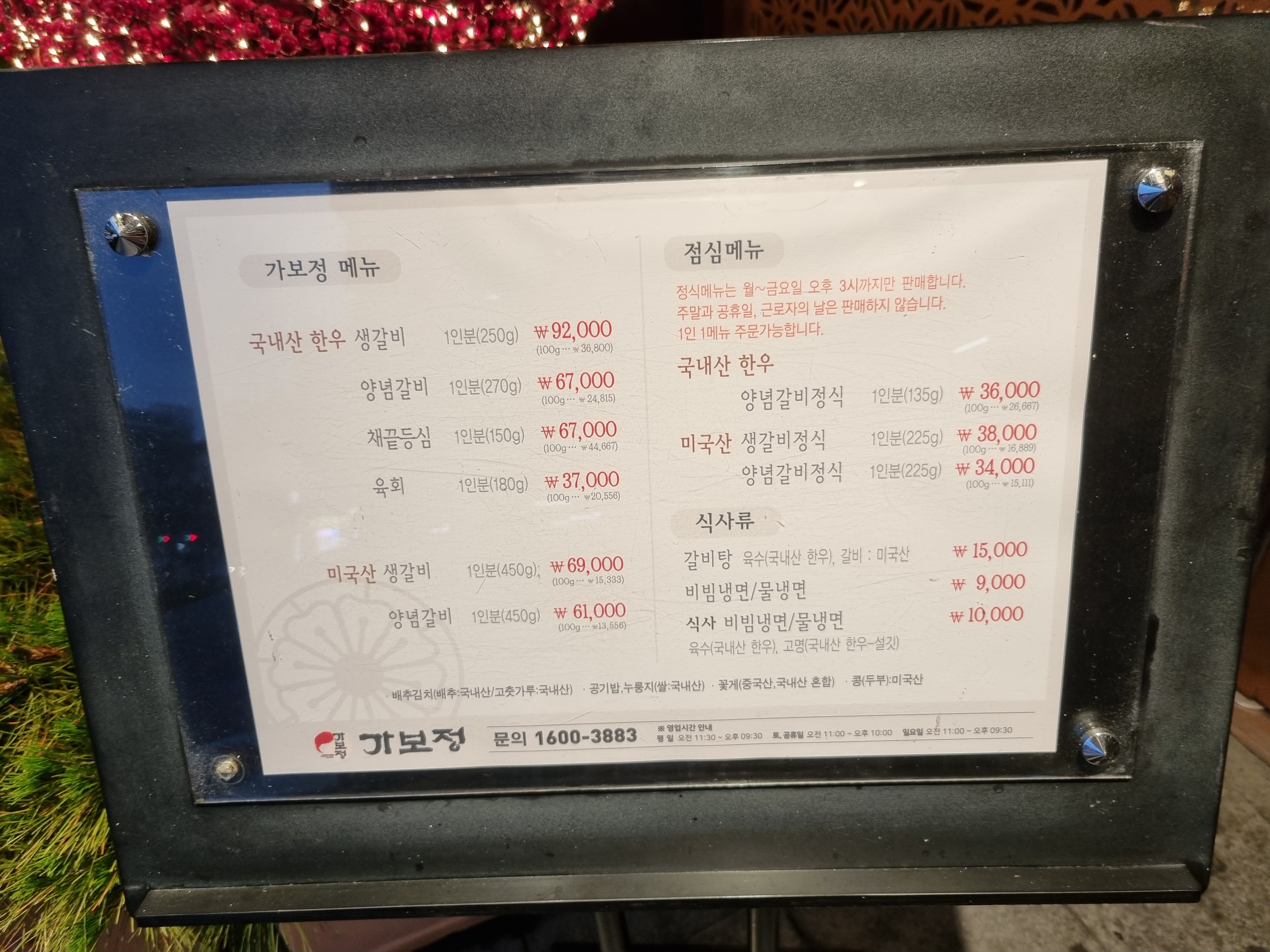 가보정 가게 앞에서 볼 수 있는 메뉴판입니다.