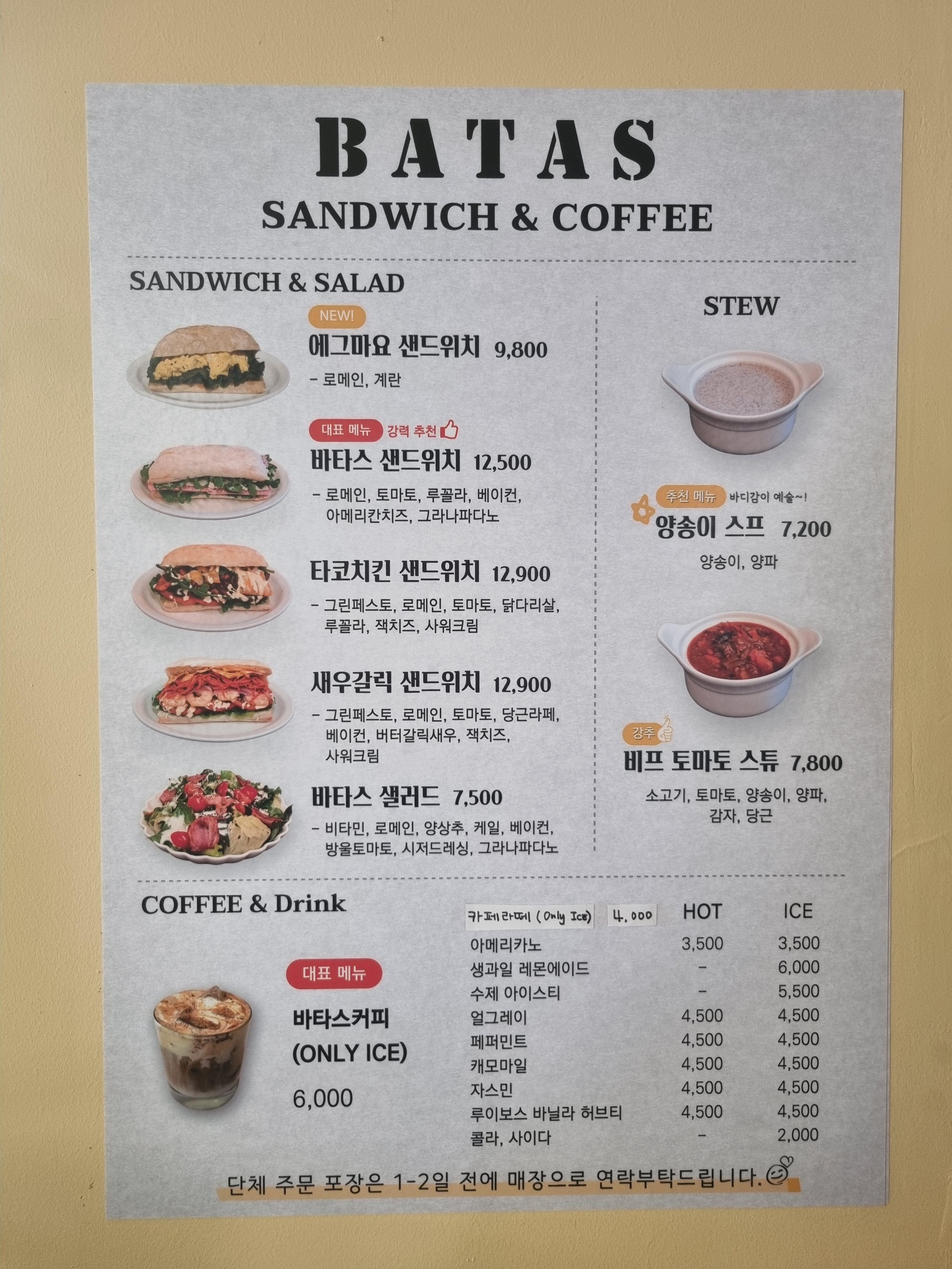 그래서 서울숲에 가져갈 샌드위치로 바타스 샌드위치와 타코치킨 샌드위치를 포장 주문했습니다.