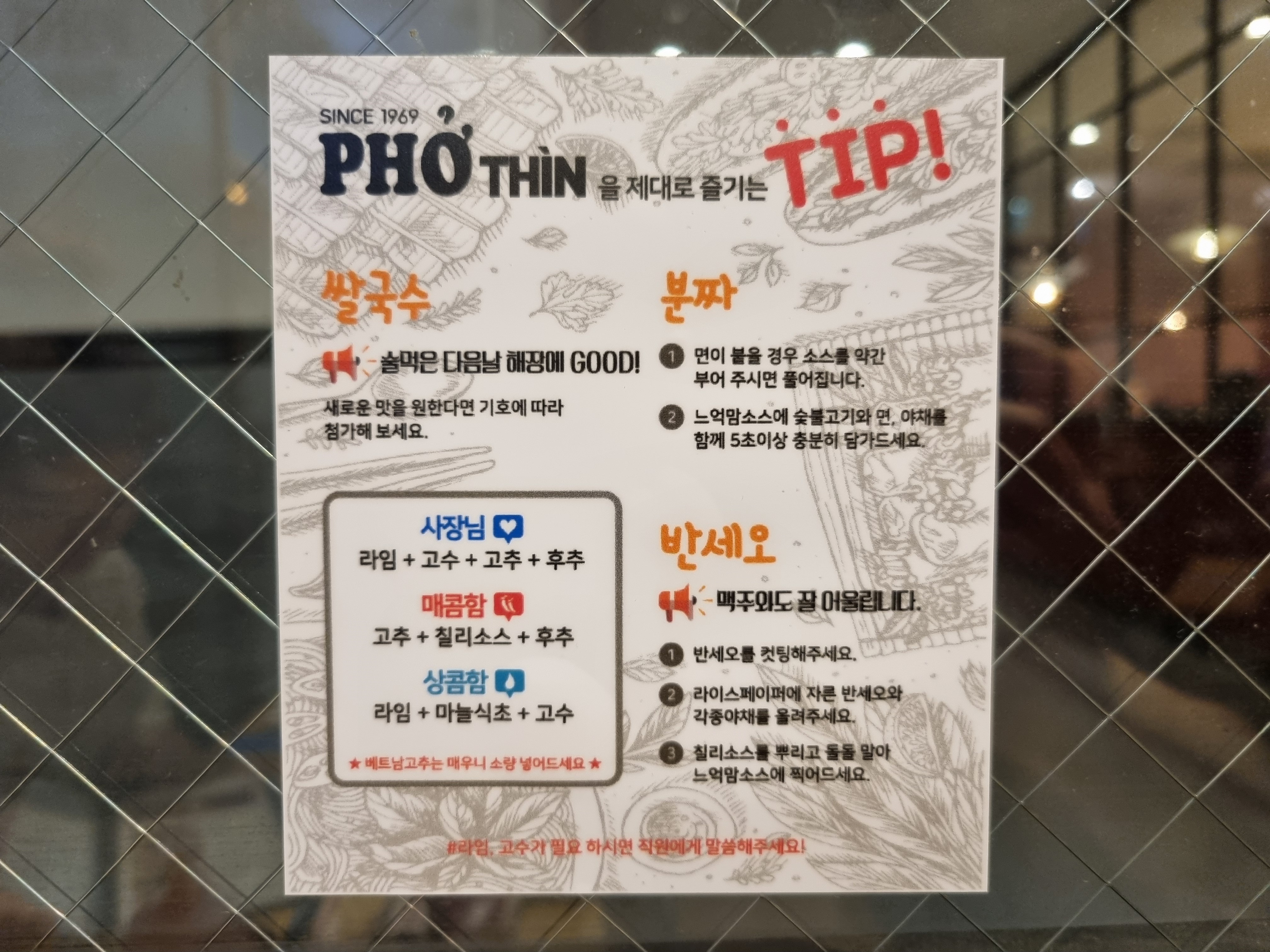 하지만 테이블마다 놓여있는 쌀국수 맛있게 먹는 꿀팁을 보고 따라해서 먹어보니 훨씬 맛이 좋았습니다.