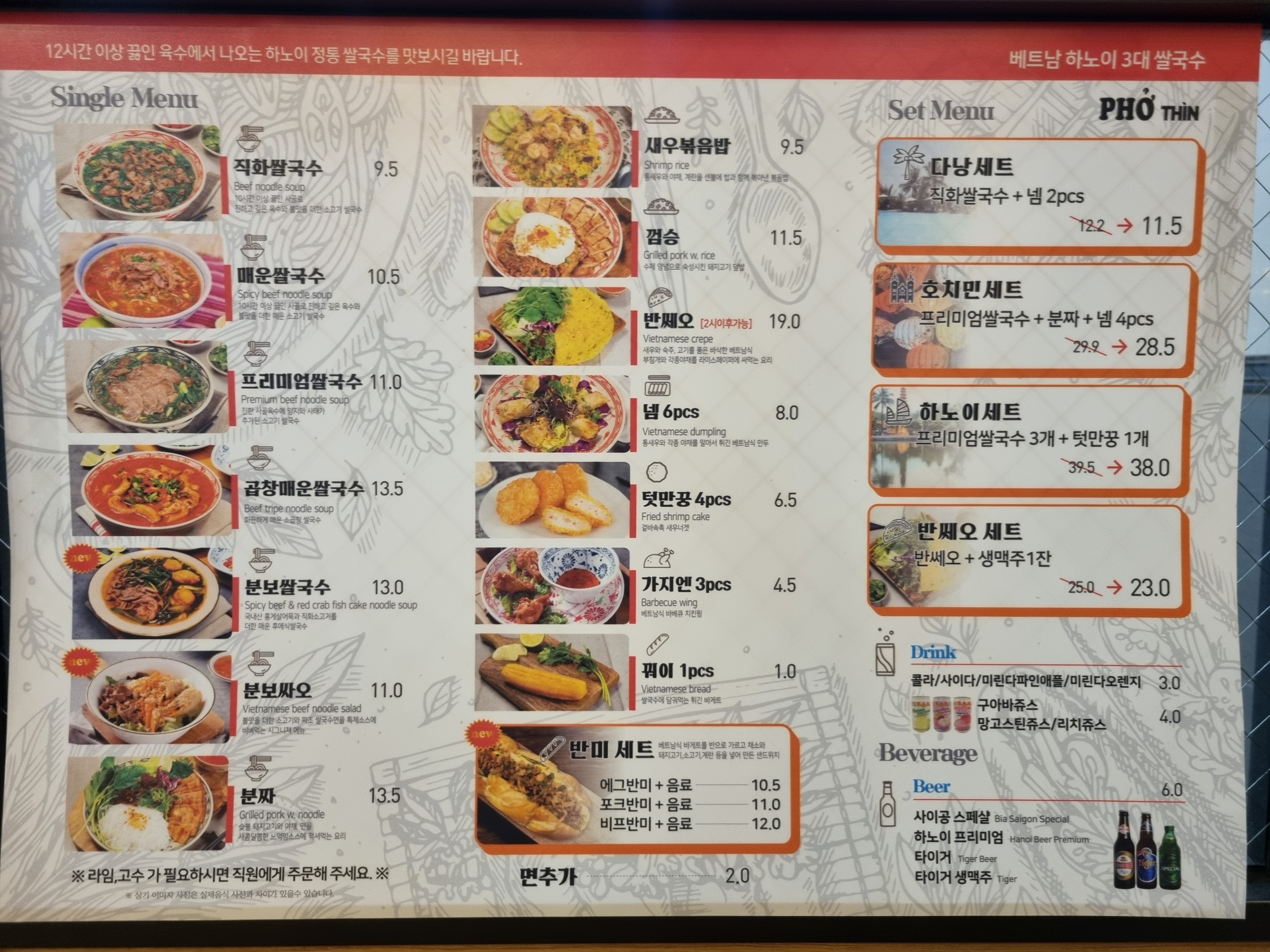 베트남 하노이 3대 쌀국수 퍼틴 메뉴입니다.