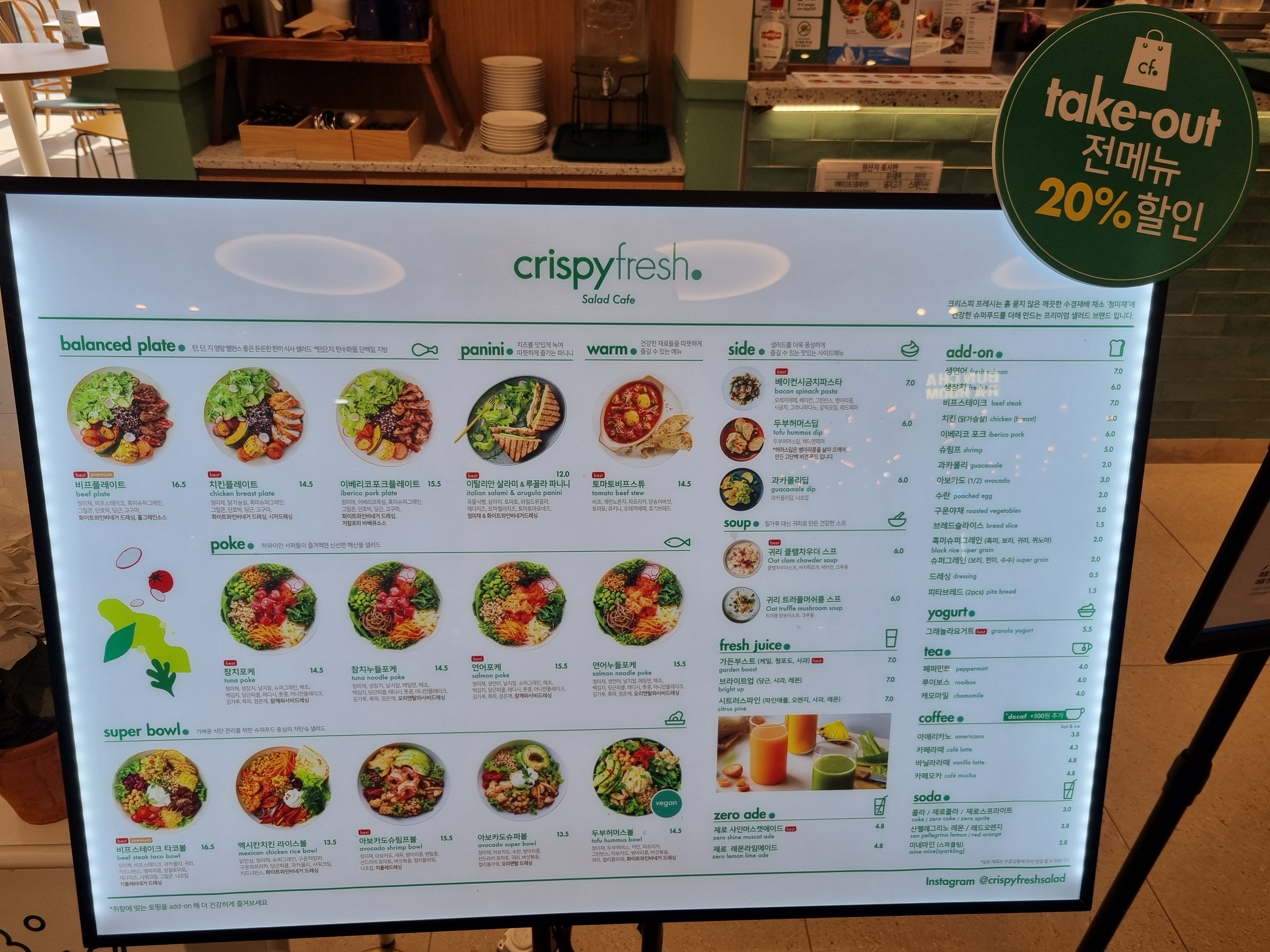 또한, 샐러드를 주문하면 아이스 아메리카노를 2,000원에 드실 수 있고 포장 시 전 메뉴 20% 할인된다고 하니 참고해 주시기 바랍니다.