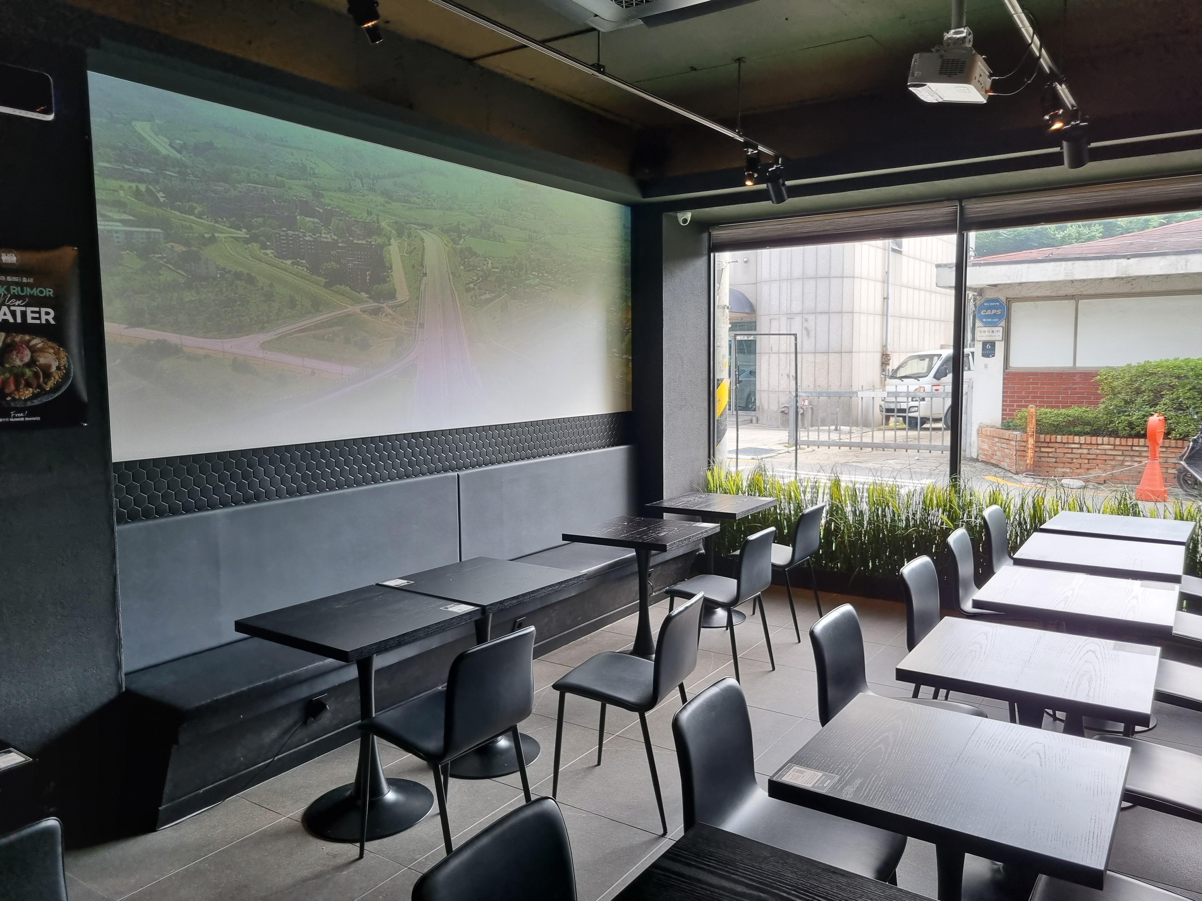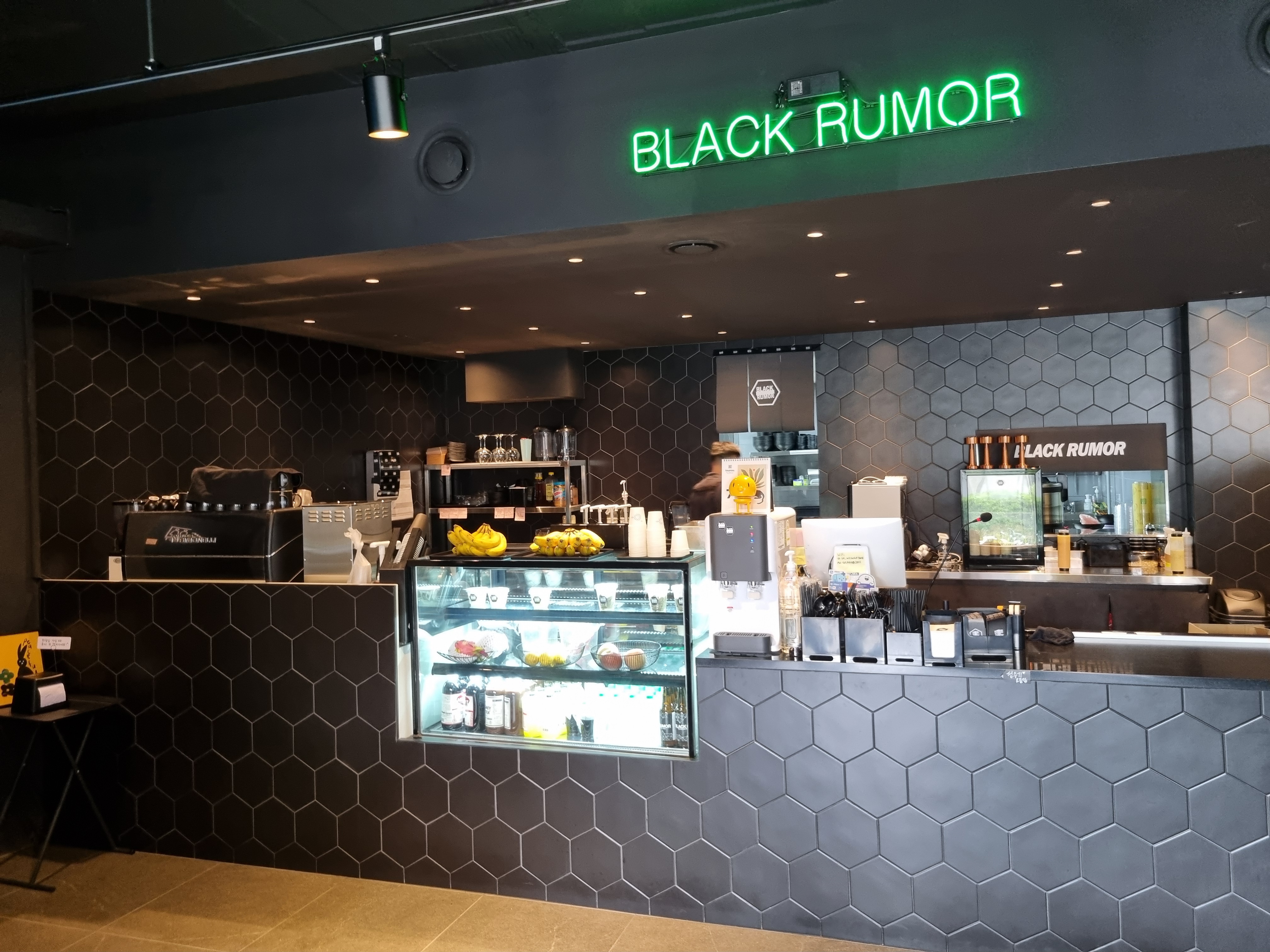 블랙 컬러로 차분하고 깔끔한 느낌에 샐러드집이라 그런지 초록색으로 포인트를 준 것 같습니다.