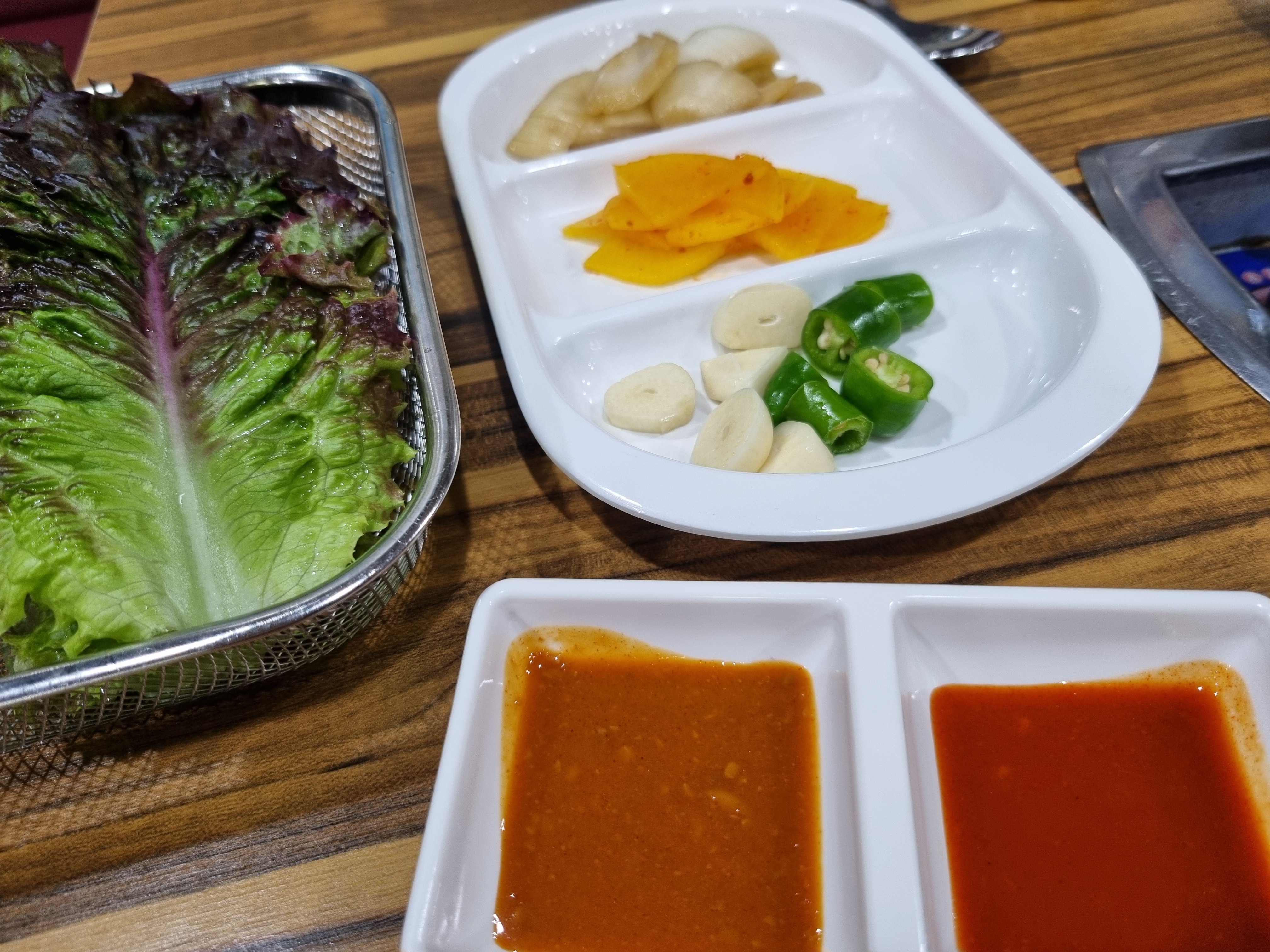 기본찬으로는 미역국과 쌈싸먹을 수 있는 상추와 마늘 고추들이 나옵니다.