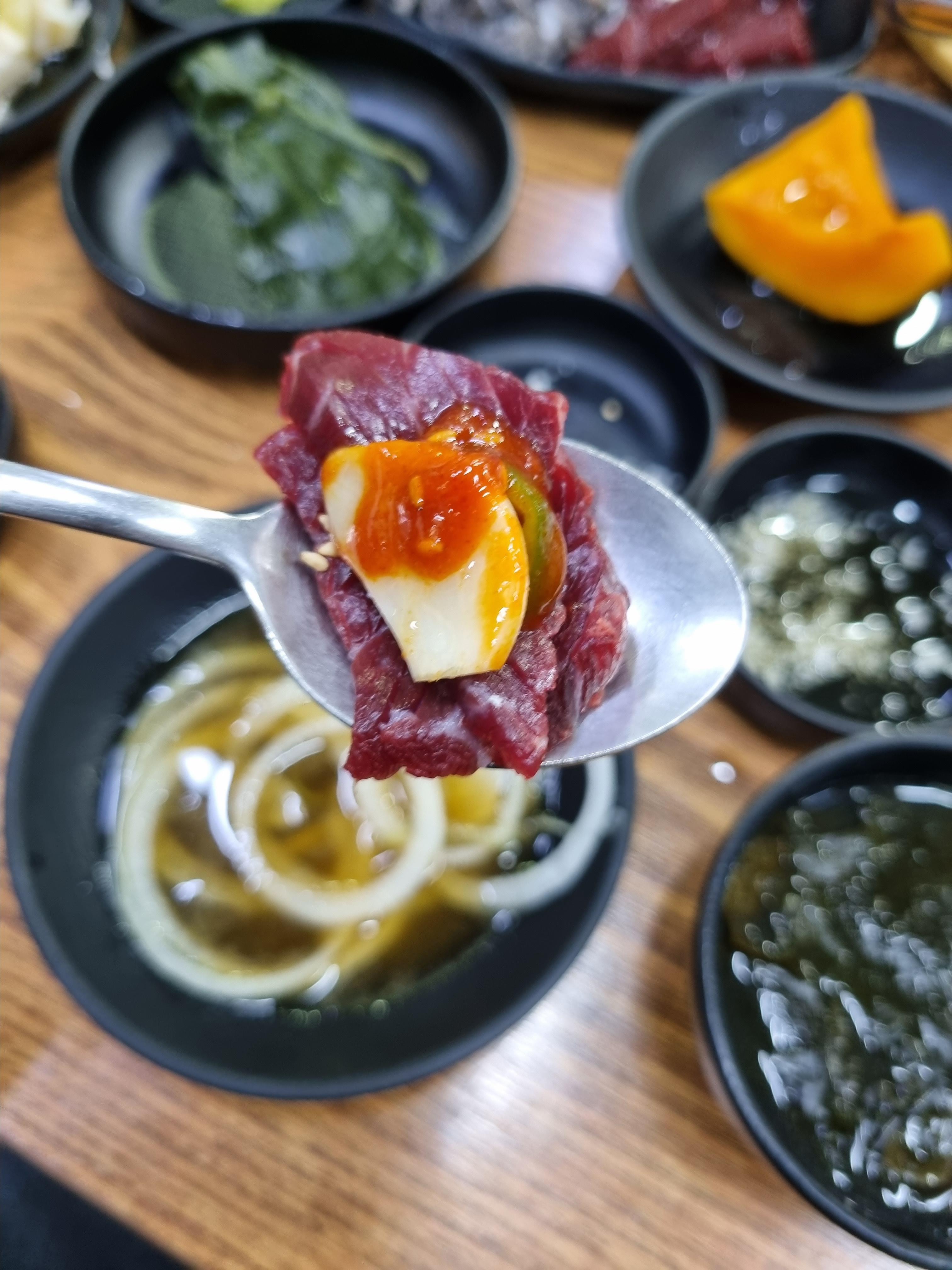 사장님께서 한우도 같이 줄 지 나중에 줄지 친절하게 물어보시는데 육사시미부터 먹고 고기를 달라고 말씀드렸습니다.