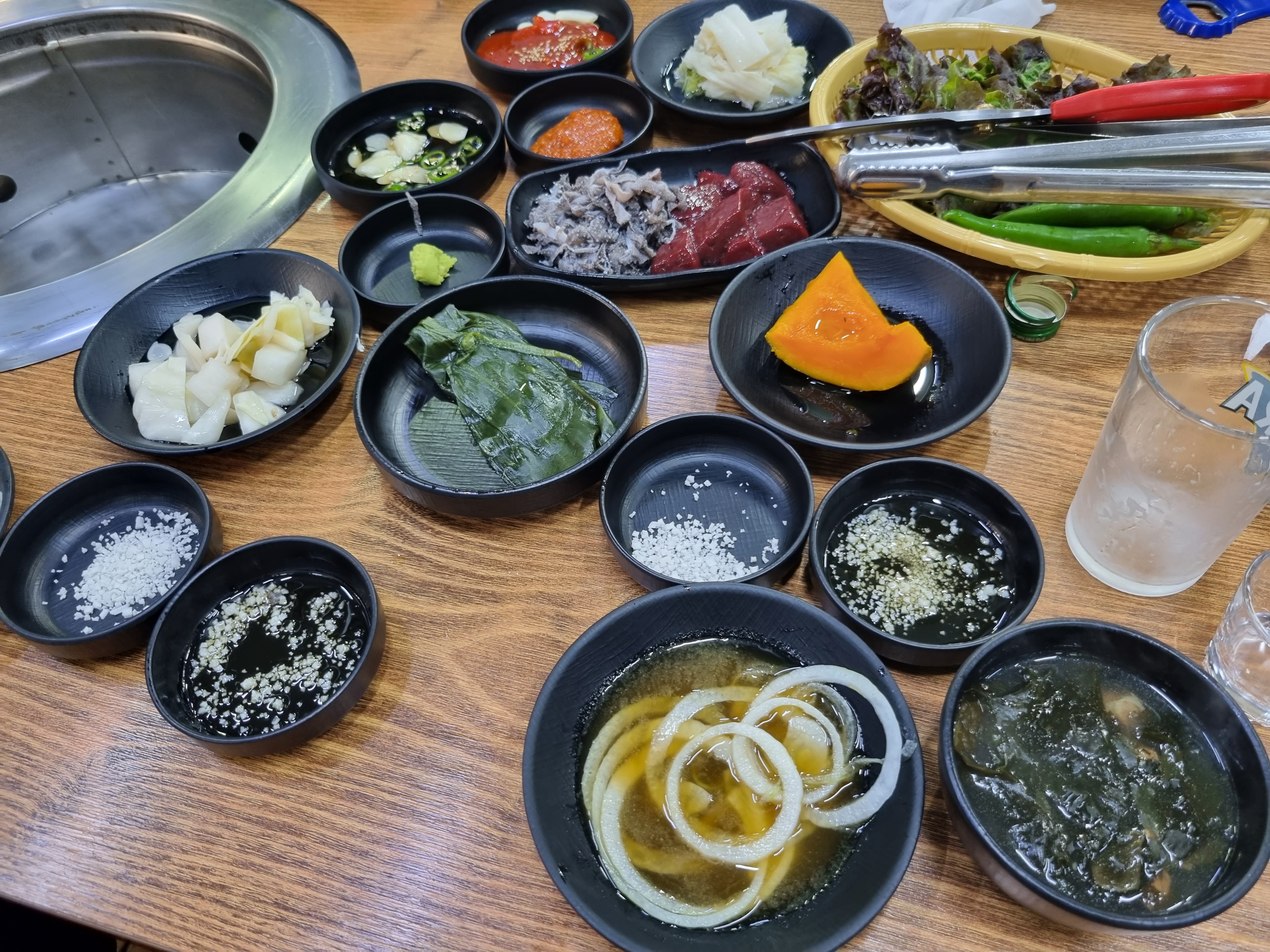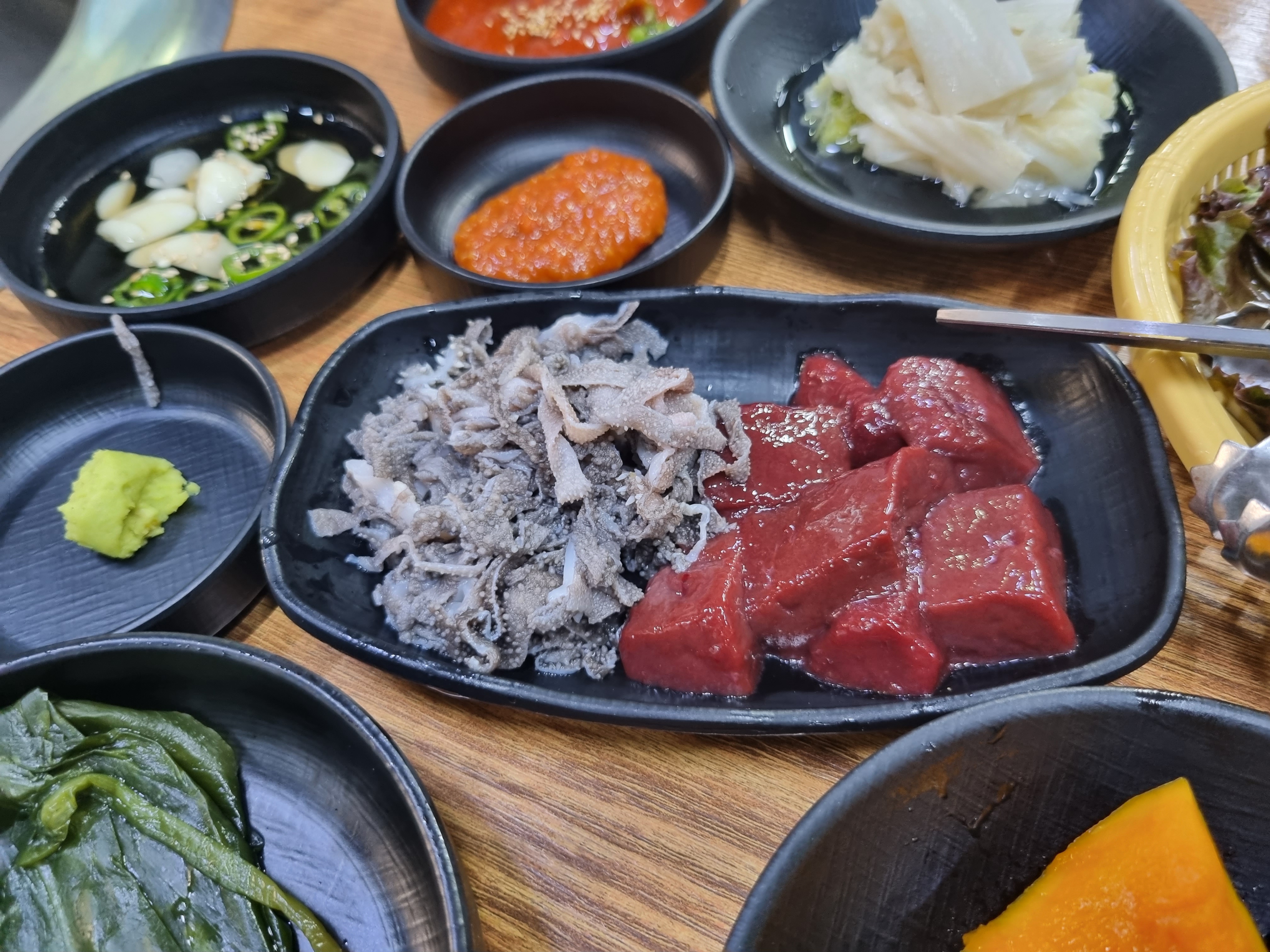 천엽은 소금장에 찍어서 한번 맛봤는데 꼬들꼬들한 식감이었고 나쁘진 않았지만 생긴게 그래서 그런지 더 손이 안갔습니다...