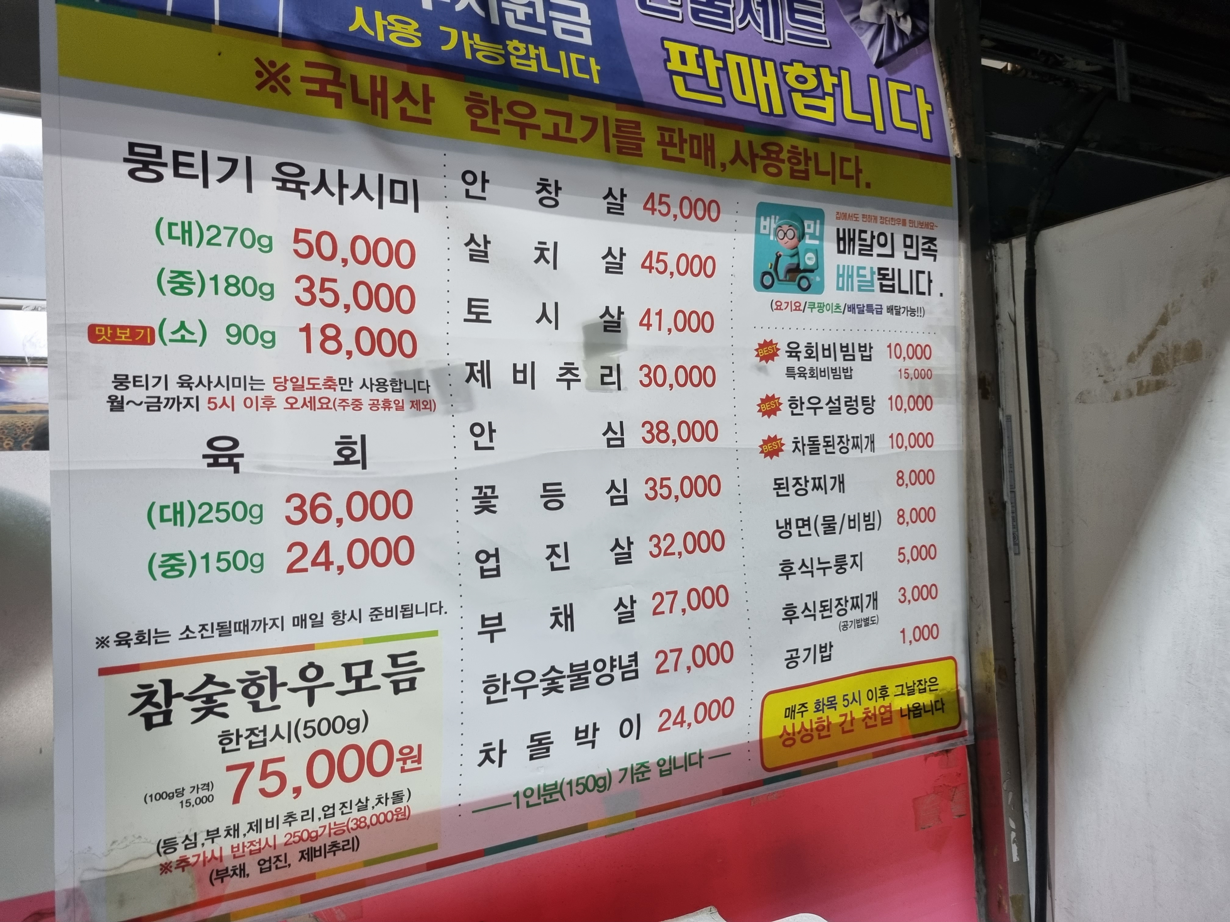 아래에서 설명 드리겠지만 뭉티기 육사시미는 당일 도축만 사용하고 월~금 5시 이후에만 맛 볼 수 있습니다.