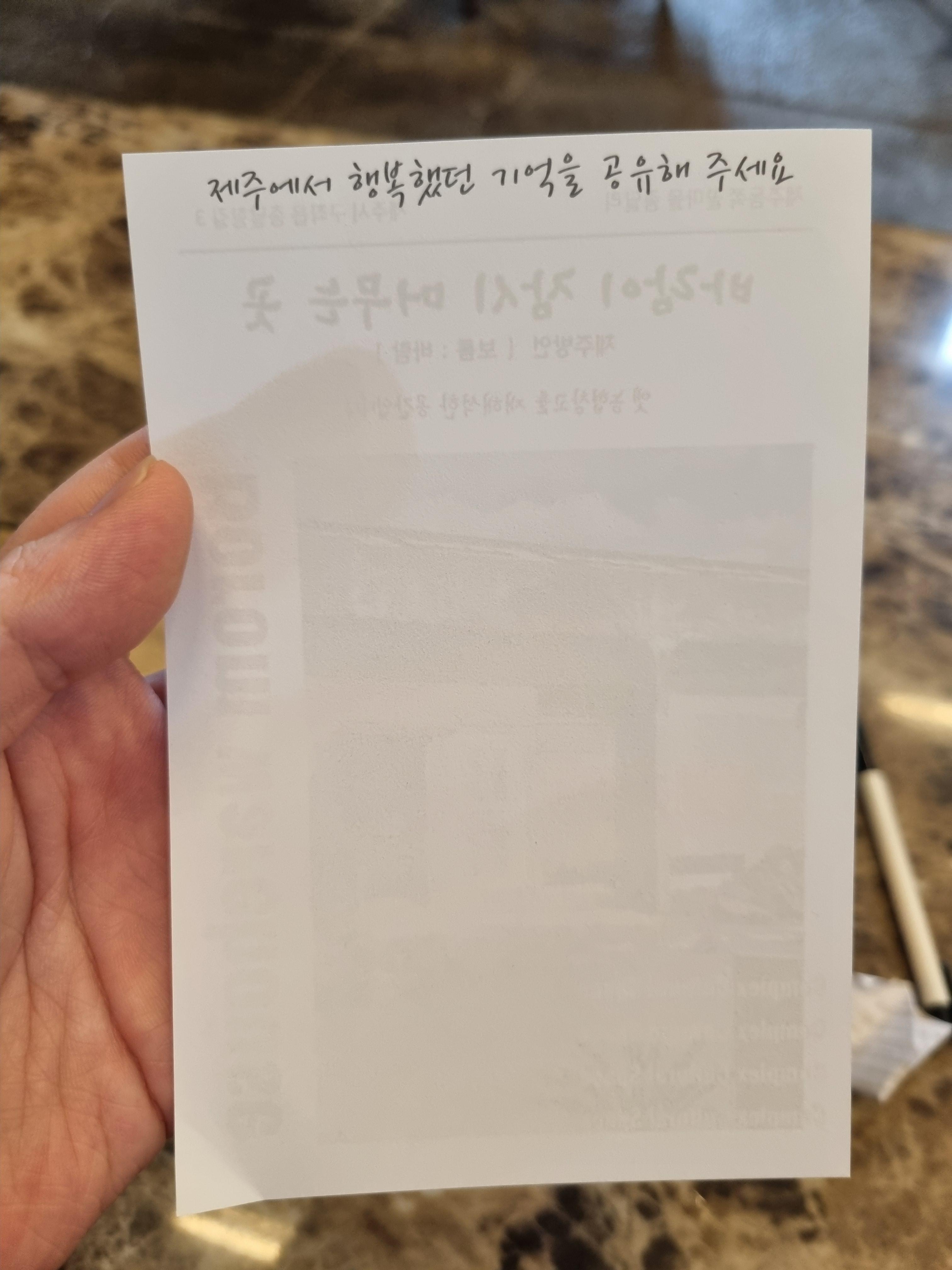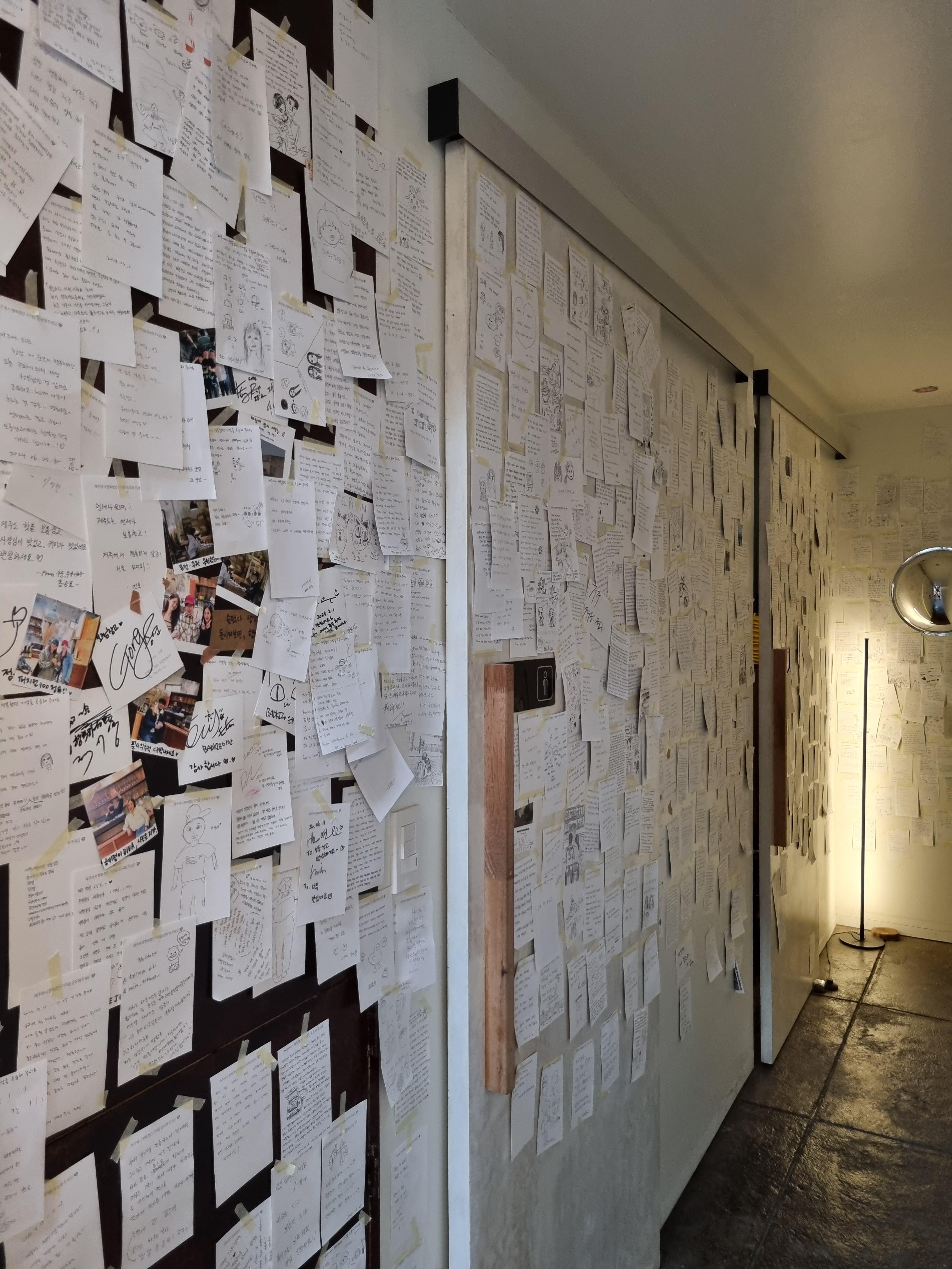 주문한 음료가 나올때 사장님께서 메모지를 한 장 주시는데 그곳에 제주에서 행복했던 기억을 적어 벽에 붙여 공유하는 것입니다.