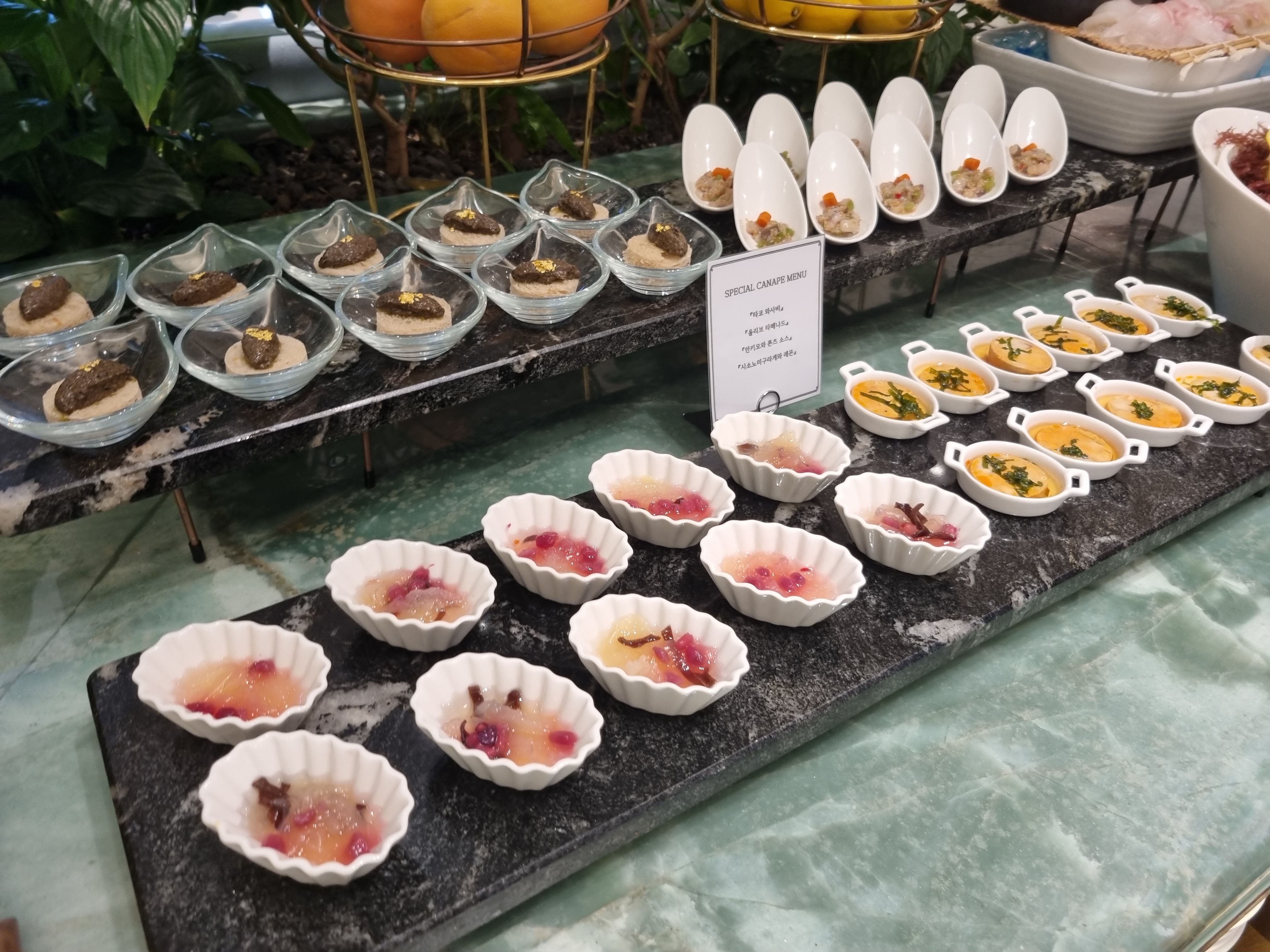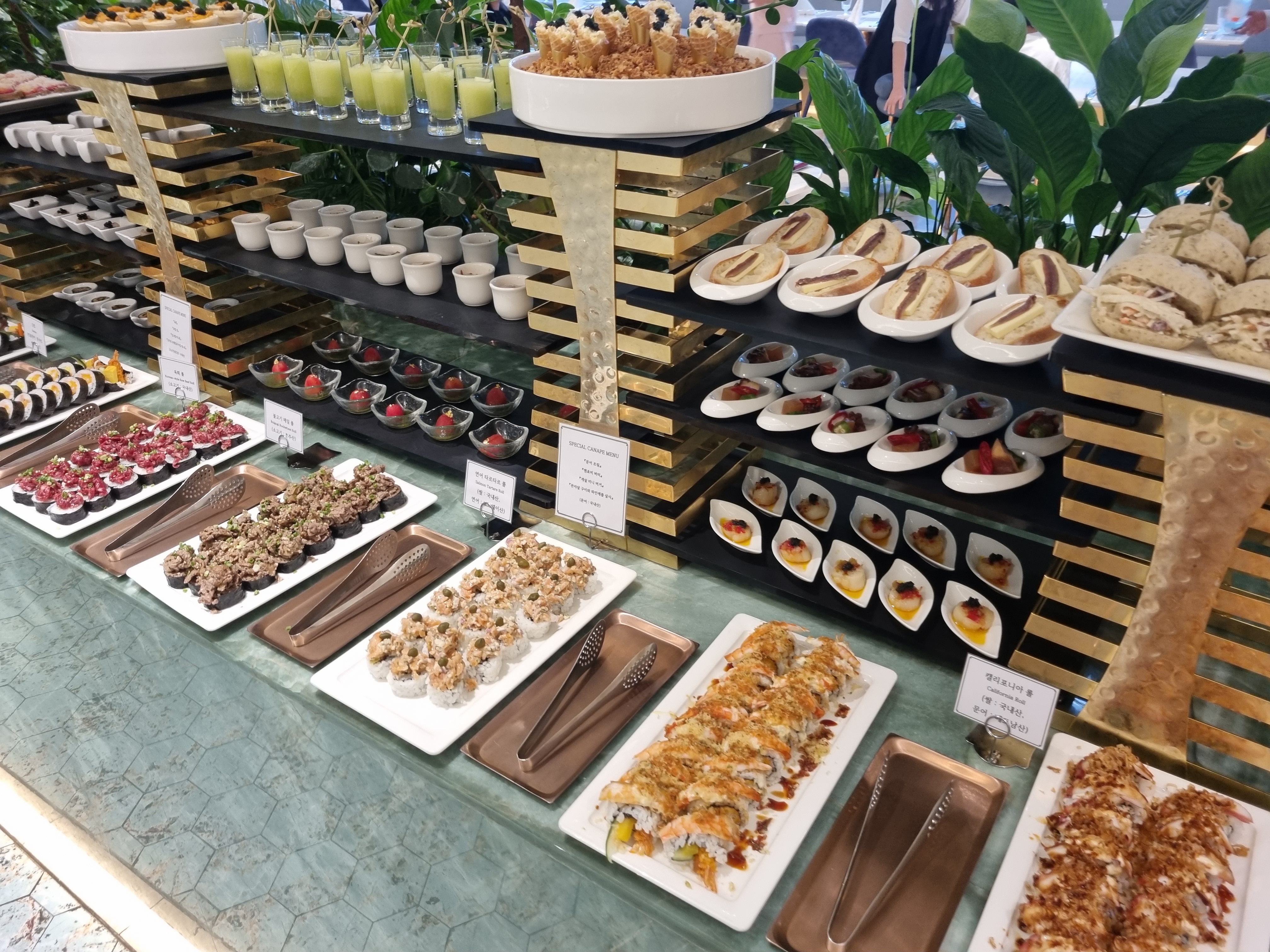 김밥, 육회 롤, 불고기 메밀 롤, 연어 타르타르 롤, 캘리포니아 롤 등 김밥 류도 준비되어 있고 스페셜 카나페 메뉴라는게 있습니다.