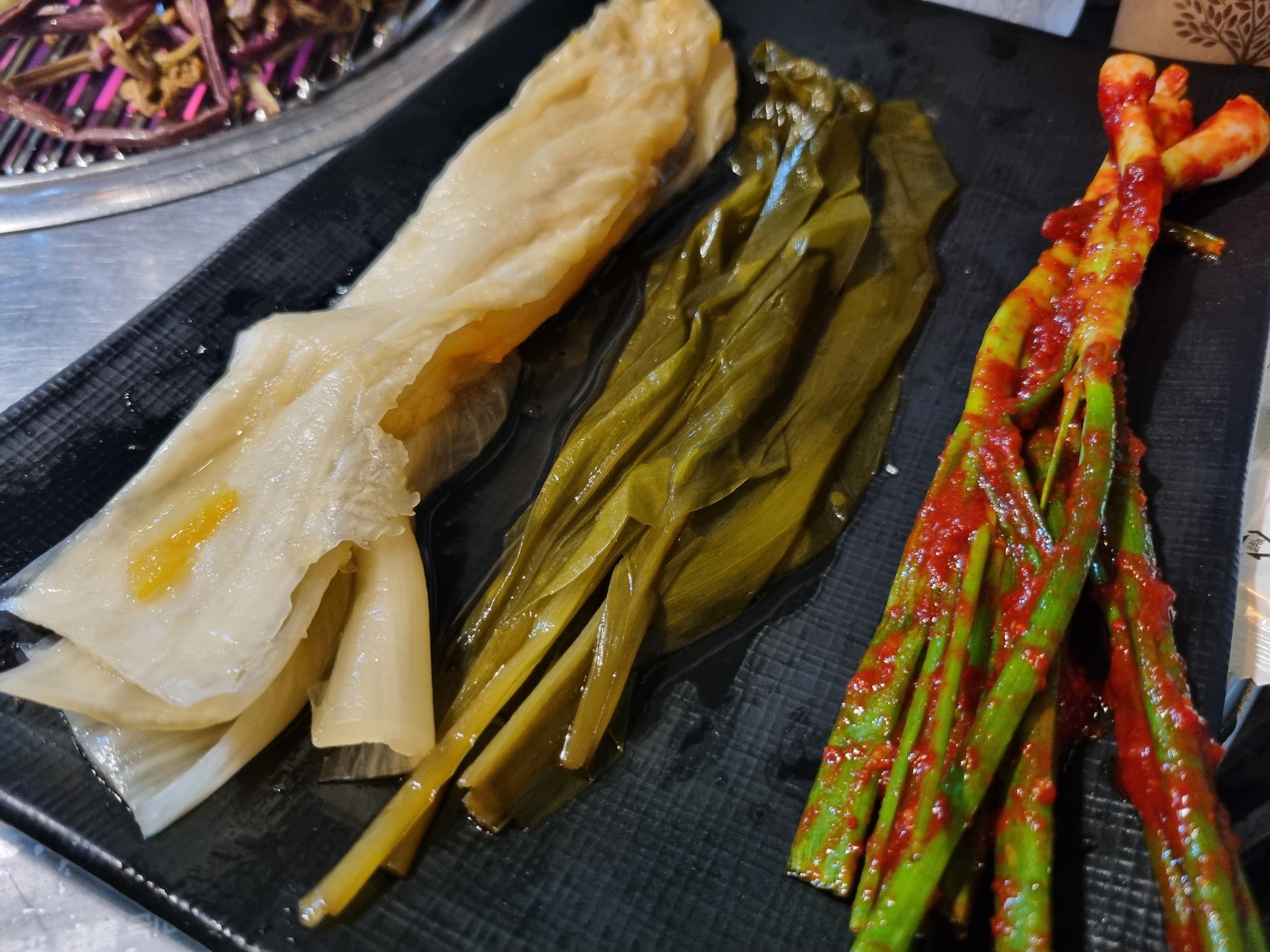 고기를 주문하면 밑반찬으로 소스와 이렇게 곁들여 먹을 수 있는 파김치, 명이나물, 백김치가 나옵니다.