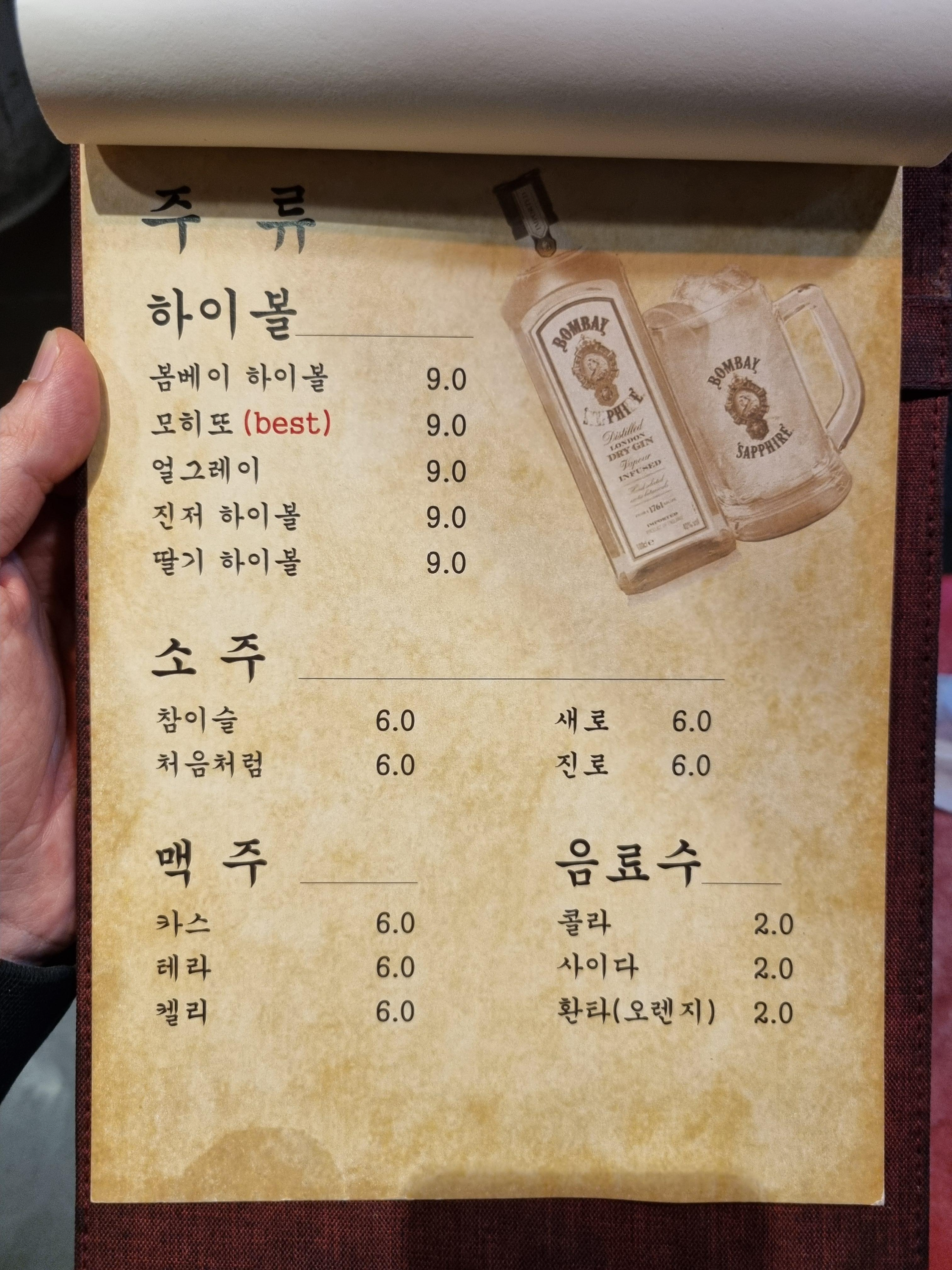 주류에는 소주부터 맥주, 하이볼, 모히또 등 다양하게 준비되어 있습니다.