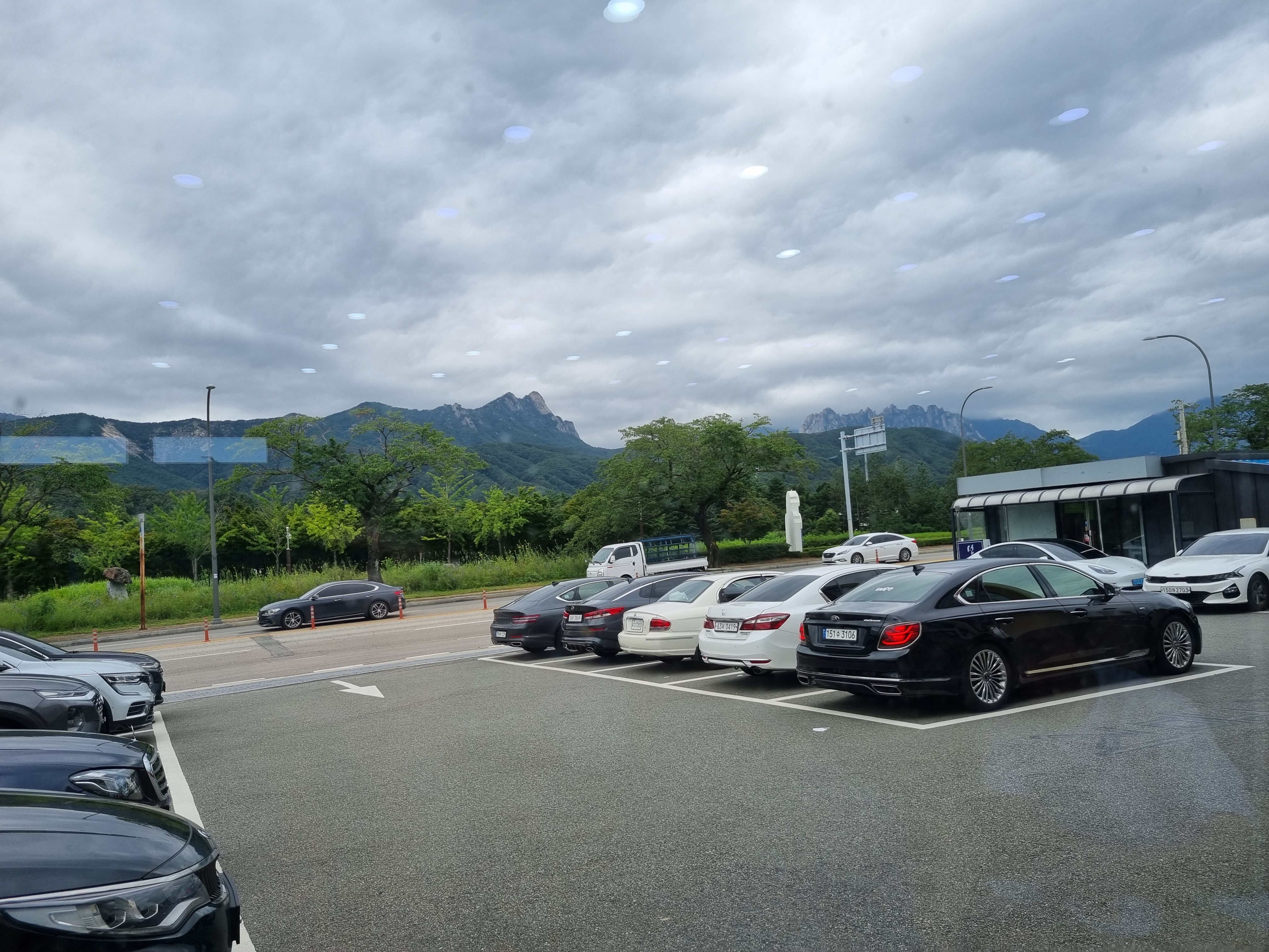창가 자리에서 바라본 주차장과 저 멀리 보이는 설악산입니다.