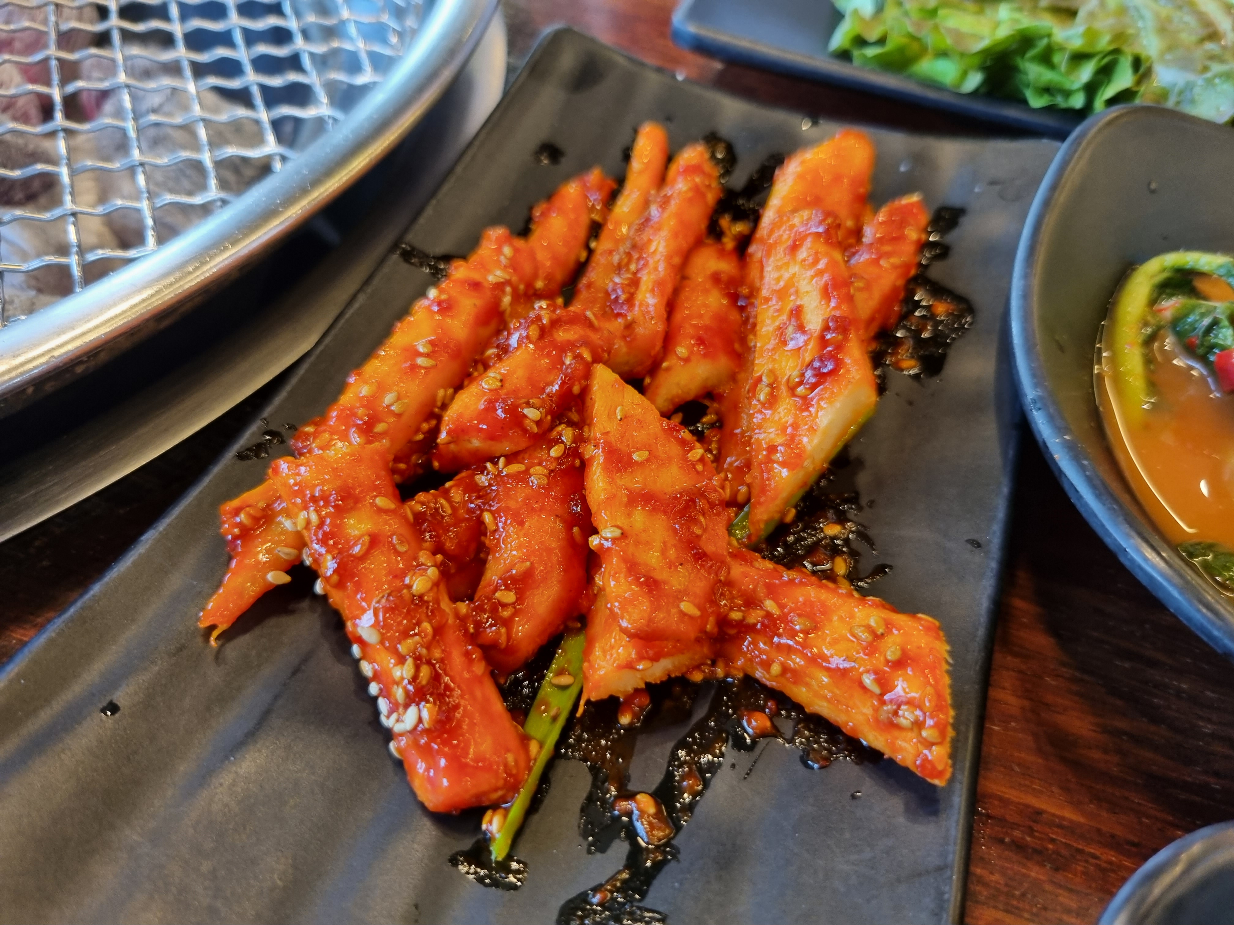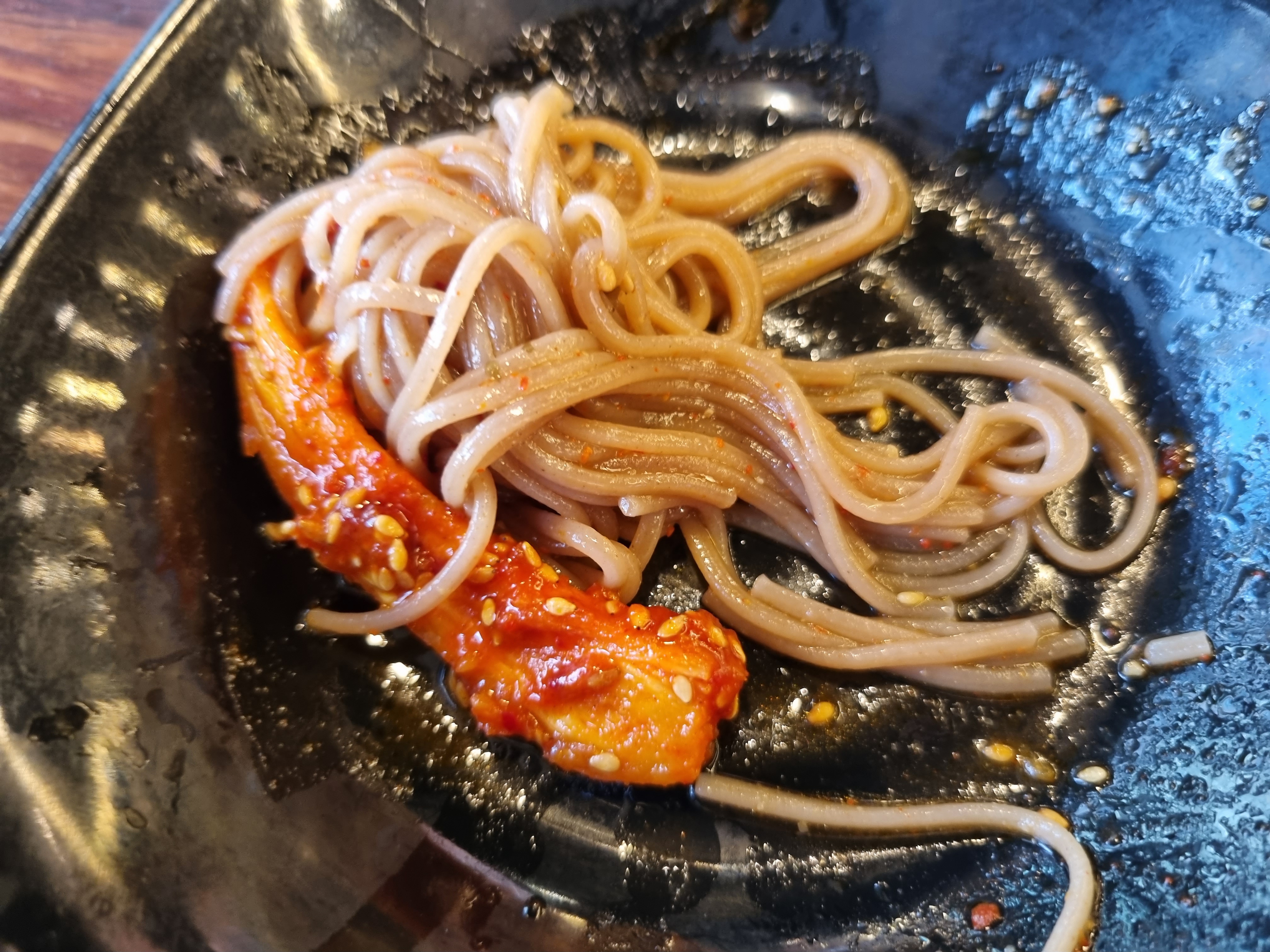 구워진 양념 더덕과 막국수를 함께 먹어봅니다.