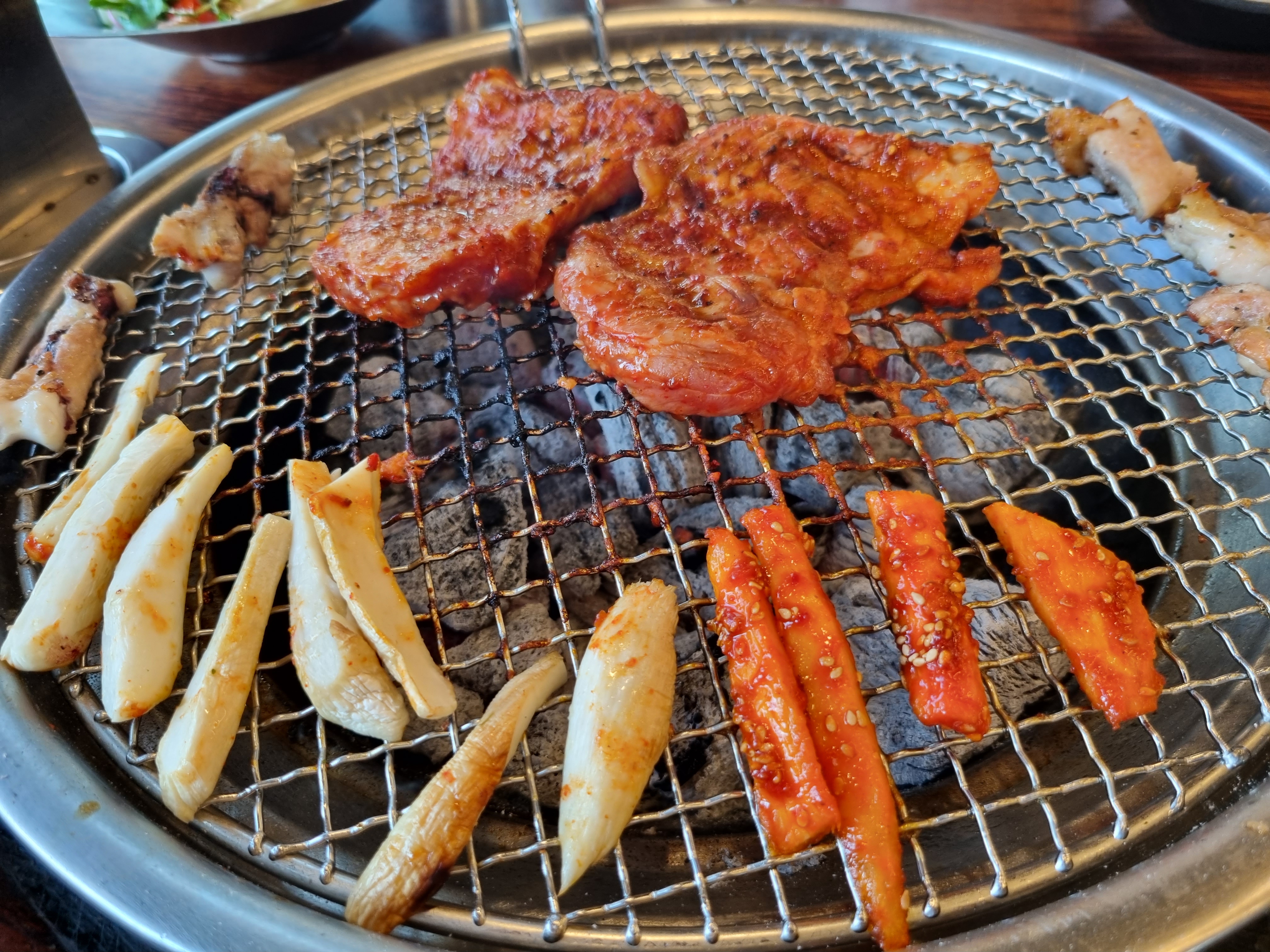구워진 소금 구이를 어느정도 먹으면서 자리가 확보되면 양념 더덕도 같이 올려서 구워줍니다.