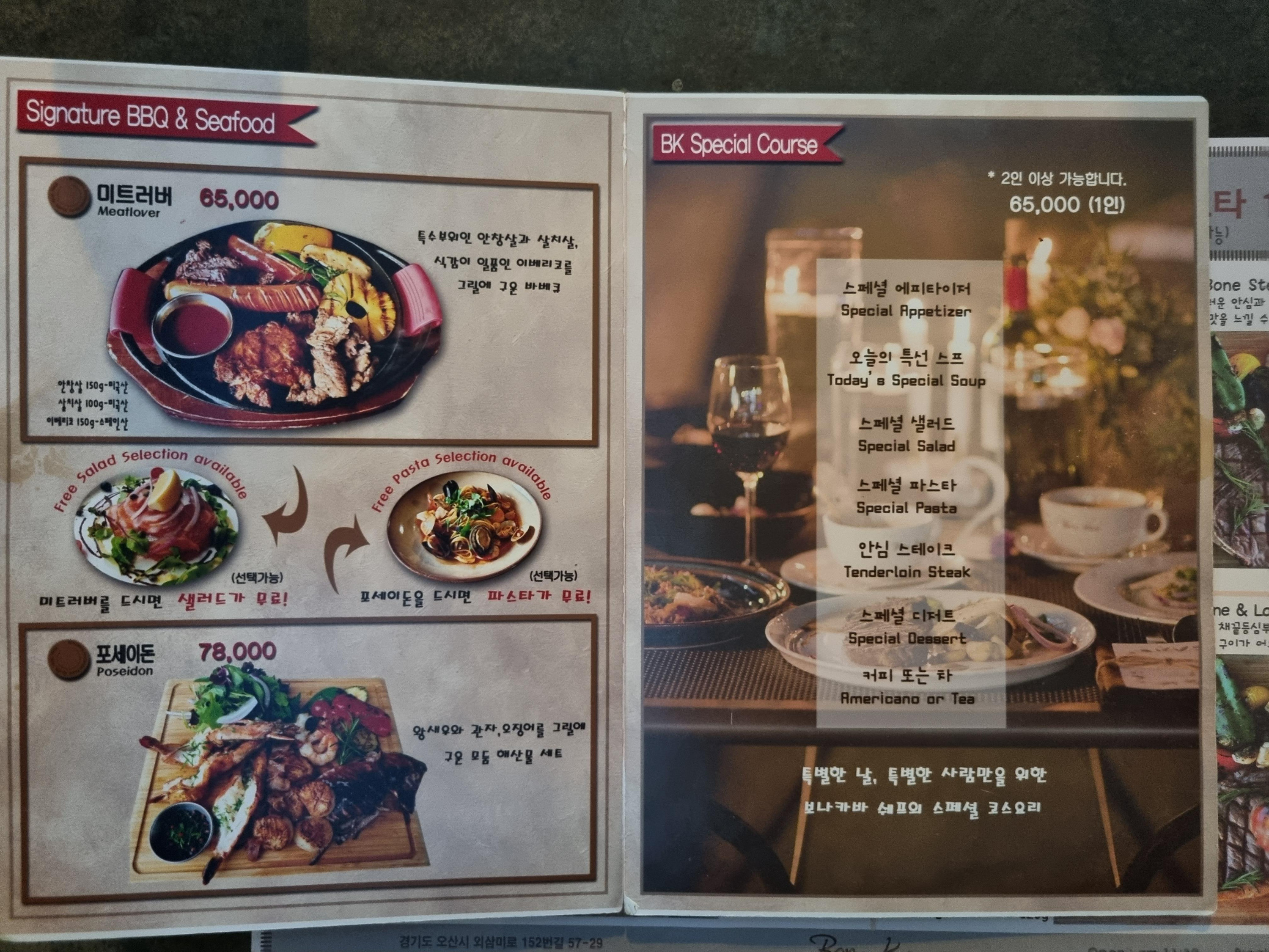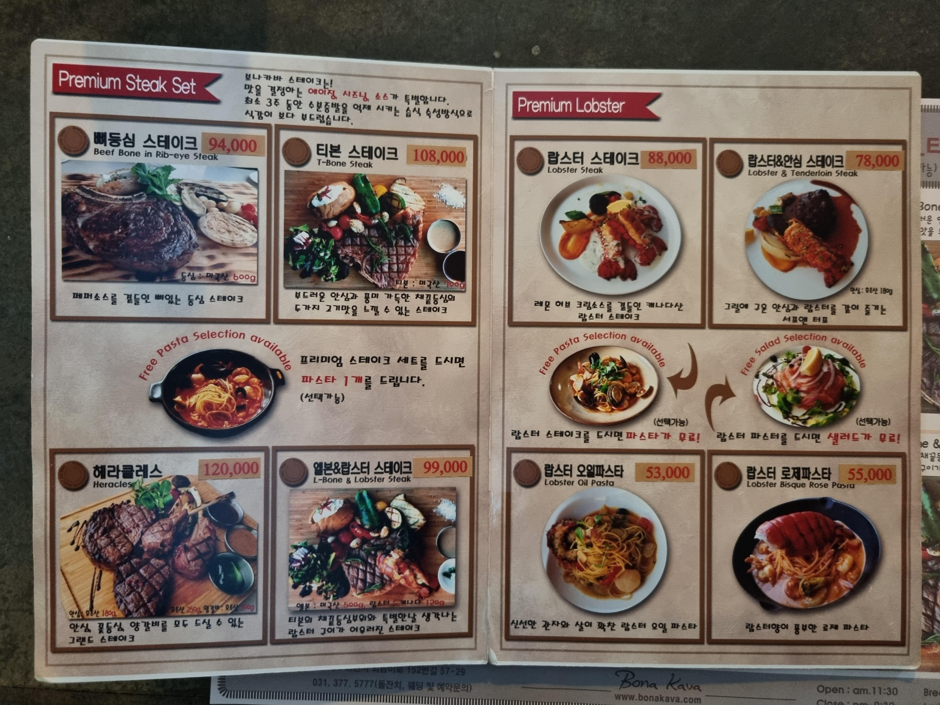 프리미엄 스테이크나 랍스터 스테이크 세트를 주문하면 파스타 1개 (선택 가능)를 무료로 드실 수 있습니다.