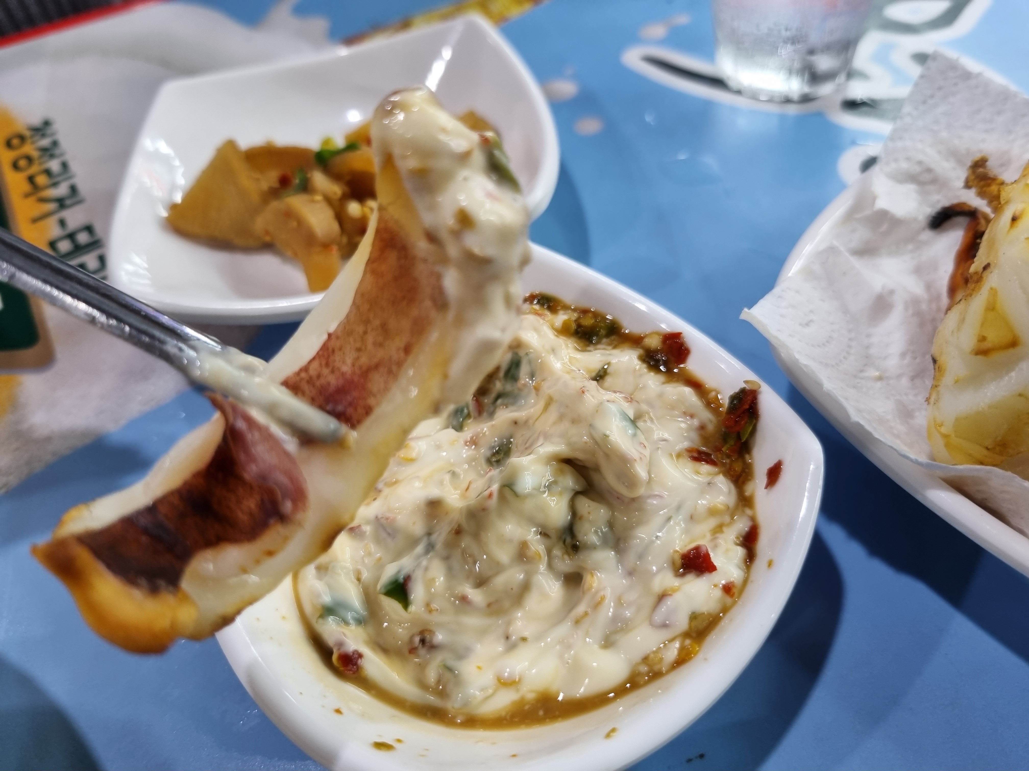 마요네즈와 깨, 고춧가루 (?) 등 여러 가지 재료를 섞어놓은것 같습니다.