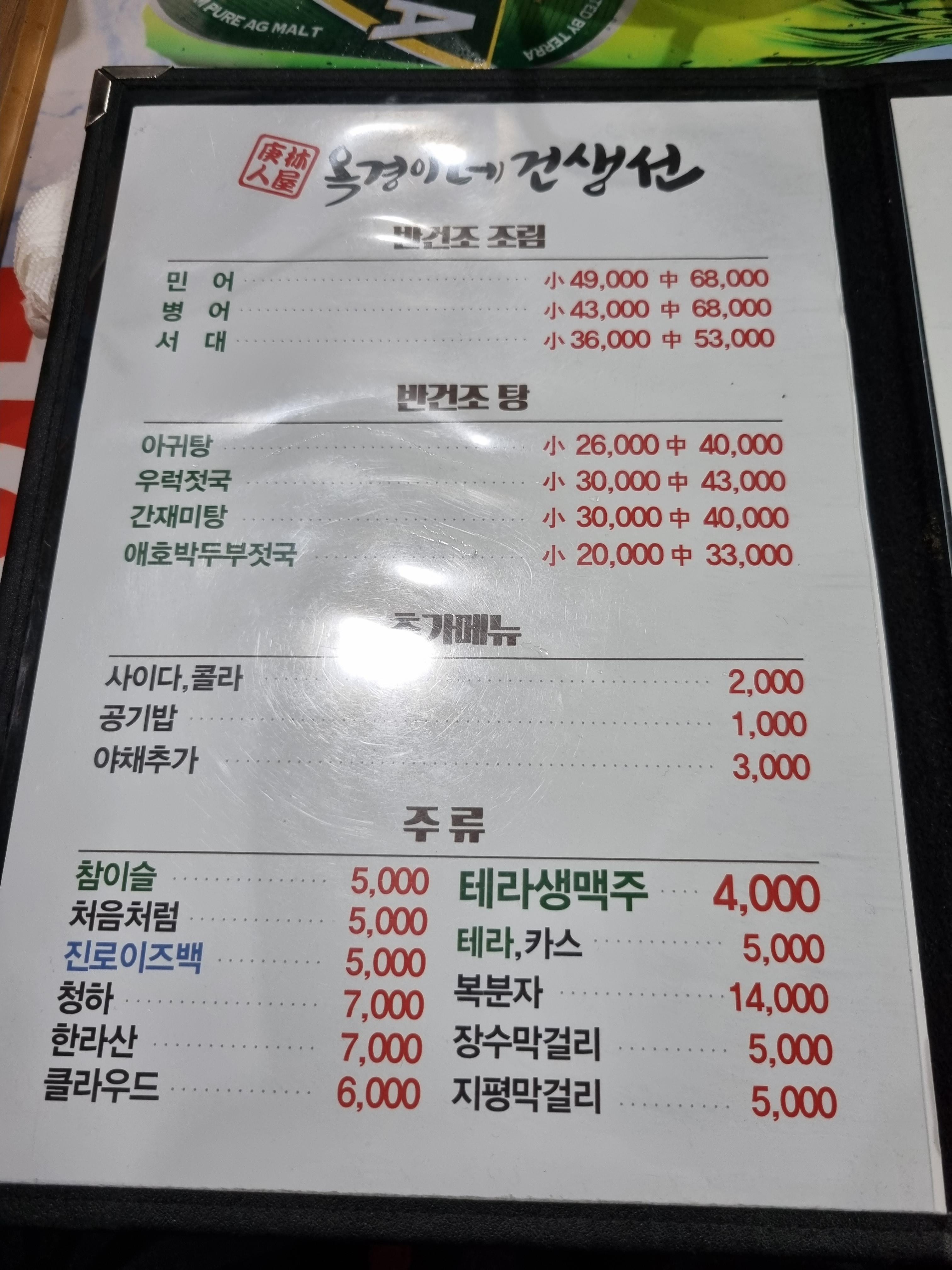 반건조 구이 찜 메뉴 가격은 아래와 같습니다.