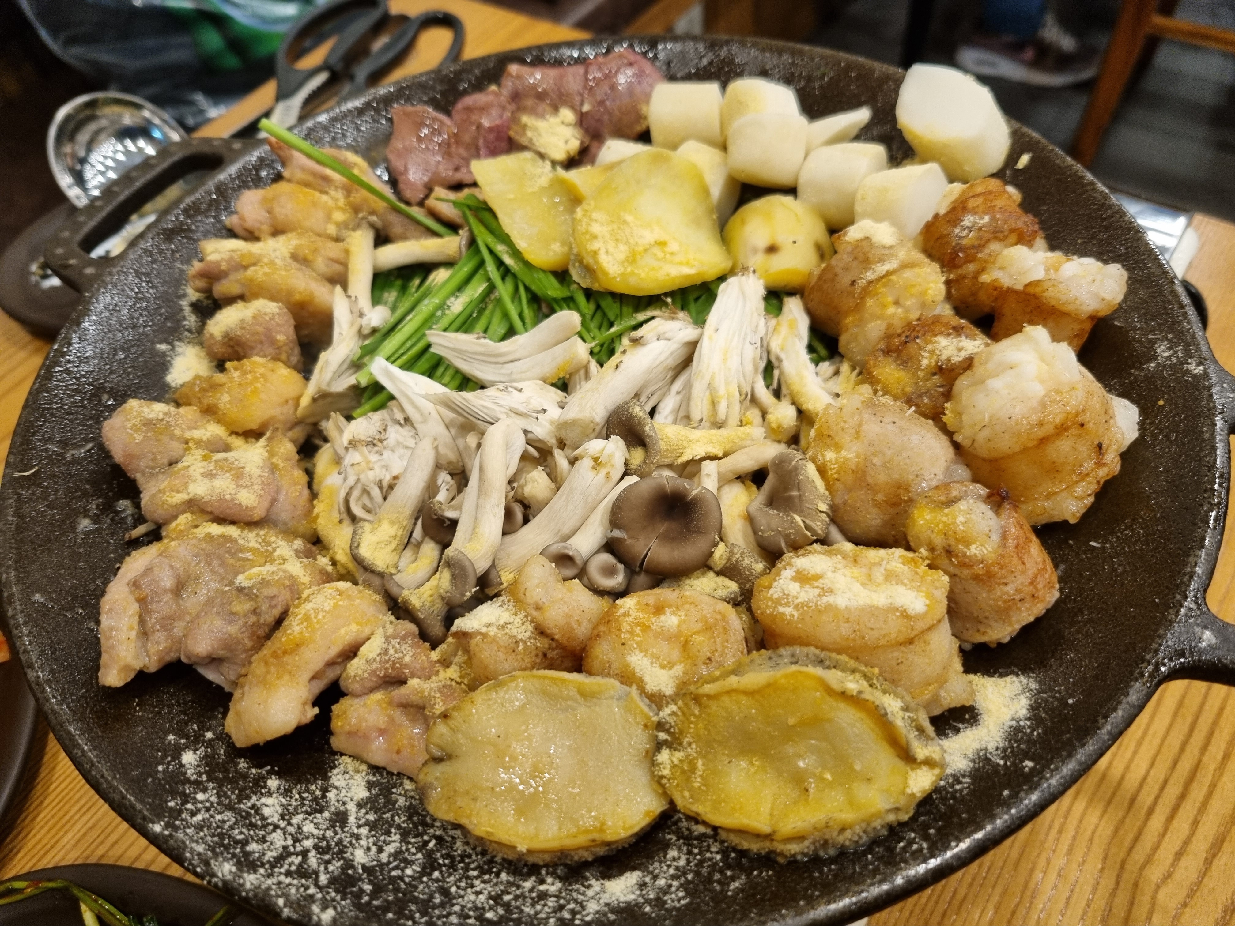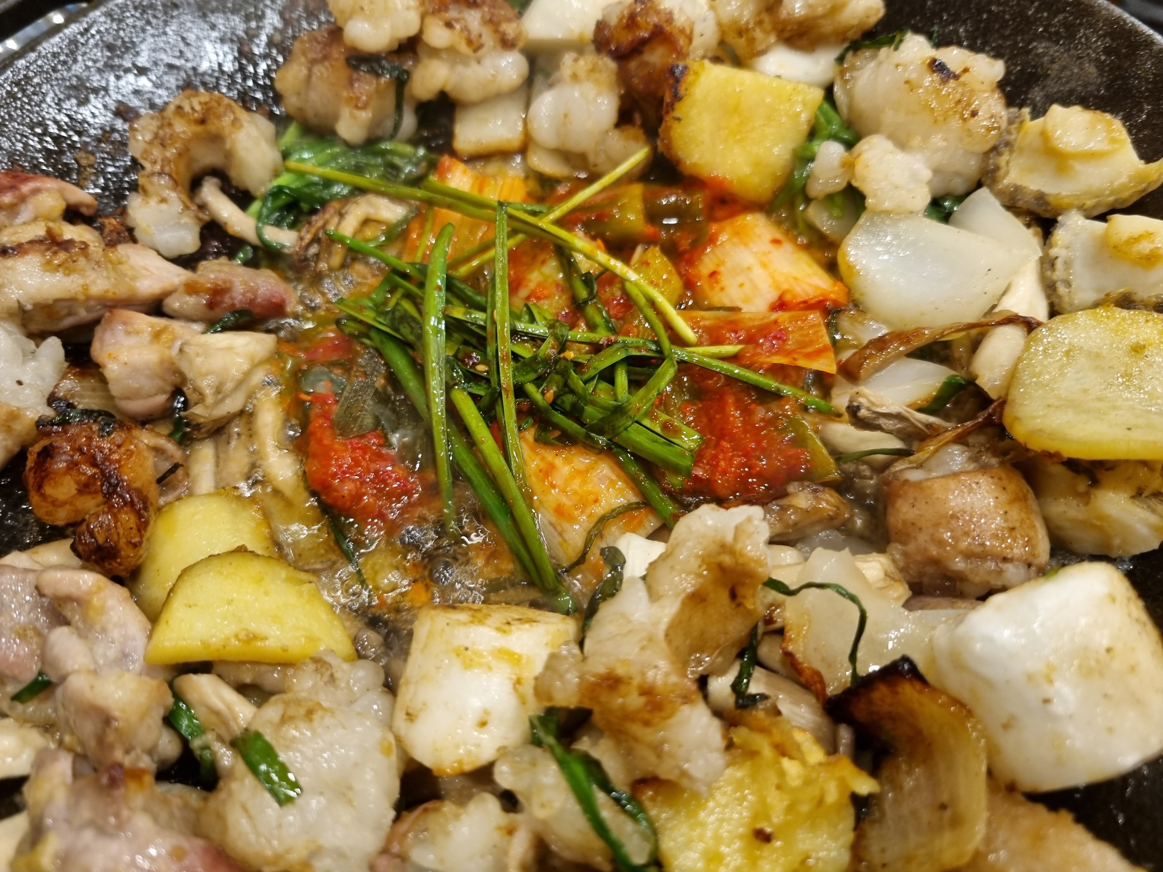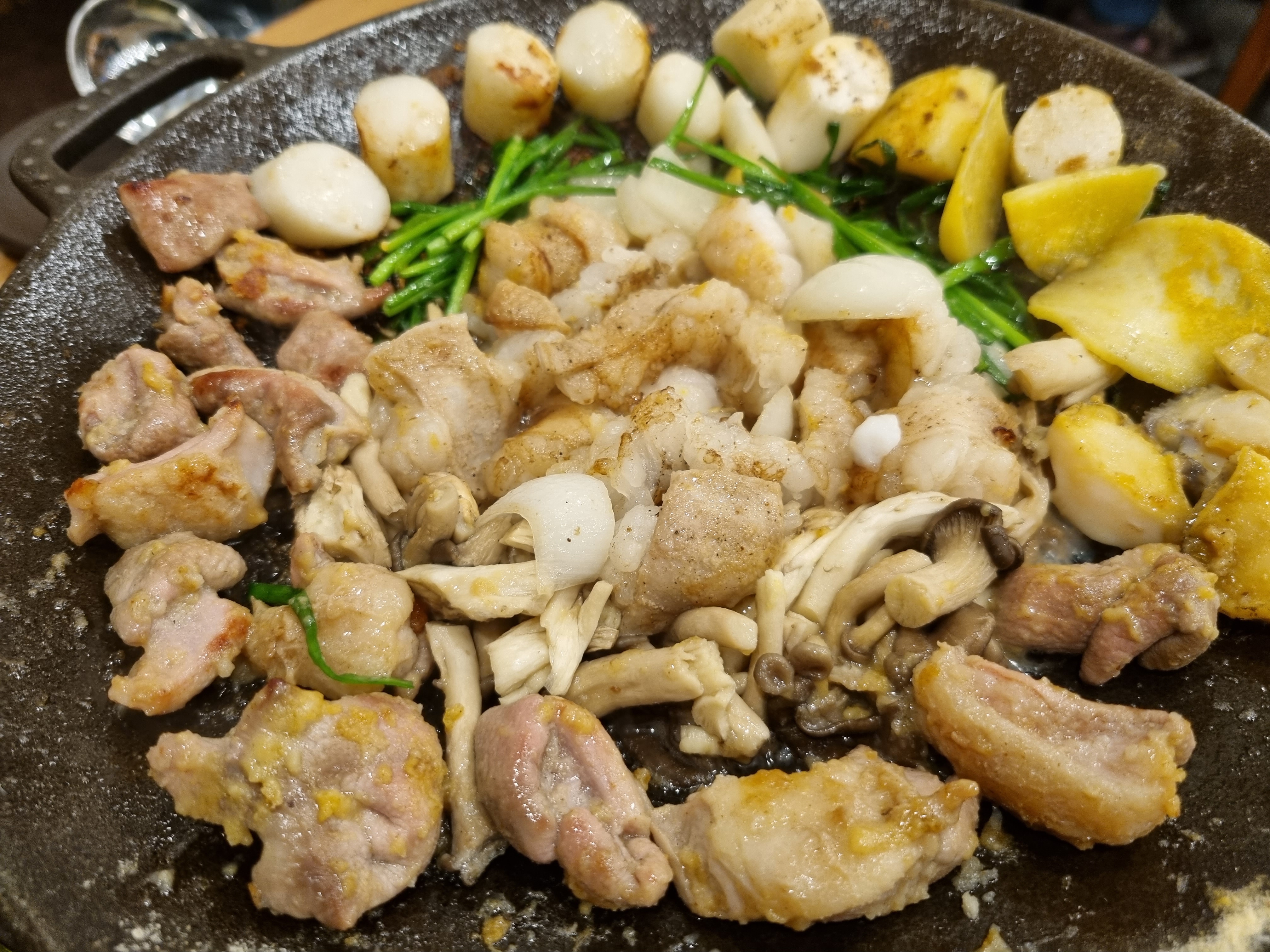 노릇노릇 익어가고 먹다가 곱창판 가운데로 쏠린 기름에 감자와 파김치인지 무슨 김치를 넣어서 구워줍니다.